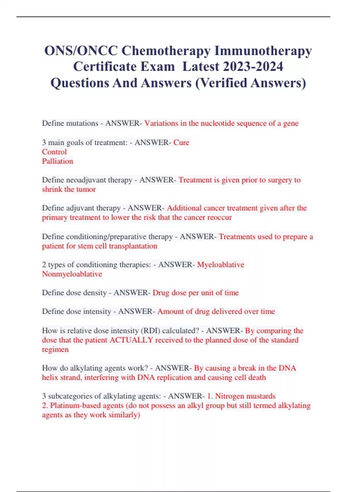 ONS/ONCC Chemotherapy Immunotherapy Certificate Exam Latest Questions And Answers (Verified Answers) Define mutations - ANSWER- Variations in the nucleotide sequence of a gene 3 main goals of treatment: - ANSWER- Cure Control Palliation Define neoadjuvant therapy - ANSWER- Treatment is given prior to surgery to shrink the tumor Define adjuvant therapy - ANSWER- Additional cancer treatment given after the primary treatment to lower the risk that the cancer reoccur Define conditioning/preparative therapy - ANSWER- Treatments used to prepare a patient for stem cell transplantation 2 types of conditioning therapies: - ANSWER- Myeloablative Nonmyeloablative Define dose density - ANSWER- Drug dose per unit of time Define dose intensity - ANSWER- Amount of drug delivered over time How is relative dose intensity (RDI) calculated? - ANSWER- By comparing the dose that the patient ACTUALLY received to the planned dose of the standard regimen How do alkylating agents work? - ANSWER- By causing a break in the DNA helix strand, interfering with DNA replication and causing cell death 3 subcategories of alkylating agents: - ANSWER- 1. Nitrogen mustards 2. Platinum-based agents (do not possess an alkyl group but still termed alkylating agents as they work similarly) 3. Nitrosoureas Most common subcategory of alkylating agents: - ANSWER- Nitrogen mustards Common alkylating agents: - ANSWER- Cyclophosphamide (Cytoxan) Ifosfamide (Ifex) Bendamustine (Treanda) Common platinum-based agents: - ANSWER- Cisplatin (Platinol) Carboplatin (Paraplatin) What is unique about nitrosoureas agents? - ANSWER- Able to cross the bloodbrain barrier; can be effective in treating some brain tumors Common nitrosoureas agents: - ANSWER- Carmustine (BiCNU) Lomustine (CeeNu) Streptozocin (Zanosar) Hypersensitivity can occur with late doses of: - ANSWER- Carboplatin These agents are typically categorized as highly emetogenic: - ANSWER- 1. Alkylating agents 2. Nitrosoureas Pre-administration labs for alkylating agents and nitrosoureas: - ANSWER- BUN Creatinine CBC w/ diff What is the medication Mesna used for? - ANSWER- Bladder protectant with administration of cyclophosphamide or ifosfamide Instruct pts receiving ________ to avoid exposure to cold air and consuming cold fluids for 3-4 days following treatment - ANSWER- Oxaliplatin How do antimetabolites function? - ANSWER- By blocking DNA and RNA growth by interfering with enzymes needed for normal cell metabolism Antimetabolites work in the ___ phase. - ANSWER- S What types of cells are best affected by antimetabolites? - ANSWER- Cells with high division rates Common side effects of antimetabolites: - ANSWER- Myelosuppression GI toxicities Photosensitivity Hand-foot syndrome Common antimetabolite drugs: - ANSWER- Azacitidine Capecitabine 5-FU Cytarabine Decitabine Methotrexate The institute for Safe Medication Practices recommends what route of administration for vincristine? - ANSWER- IV piggyback via gravity Anthracycline antitumor abx work by: - ANSWER- Interfering with enzymes necessary for DNA to replicate in ALL phases of the cell cycle The two major classifications of antitumor antibiotics are: - ANSWERAnthracyclines Non-anthracyclines