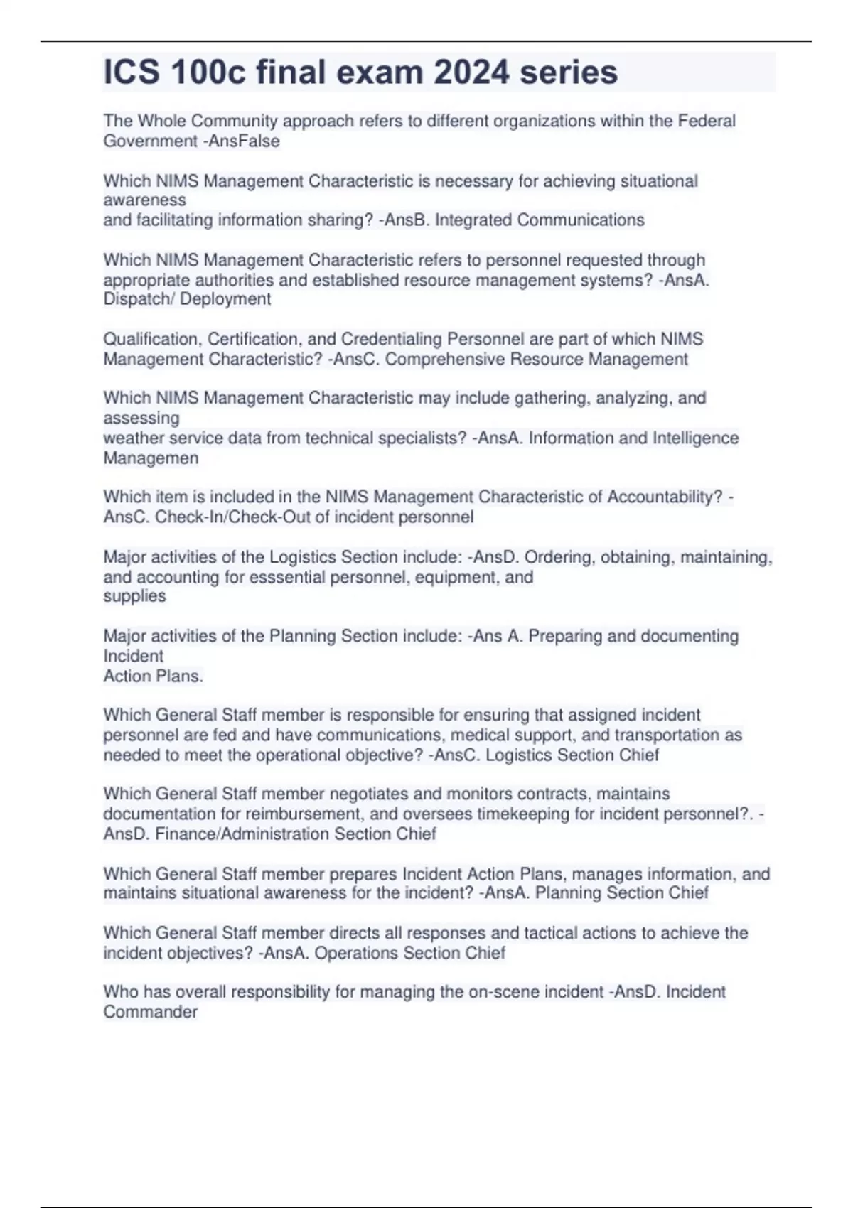 ICS 100c final exam 2024 series The Whole Community approach refers to different organizations within the Federal Government -AnsFalse Which NIMS Management Characteristic is necessary for achieving situational awareness and facilitating information sharing? -AnsB. Integrated Communications Which NIMS Management Characteristic refers to personnel requested through appropriate authorities and established resource management systems? -AnsA. Dispatch/ Deployment Qualification, Certification, and Credentialing Personnel are part of which NIMS Management Characteristic? -AnsC. Comprehensive Resource Management Which NIMS Management Characteristic may include gathering, analyzing, and assessing weather service data from technical specialists? -AnsA. Information and Intelligence Managemen Which item is included in the NIMS Management Characteristic of Accountability? - AnsC. Check-In/Check-Out of incident personnel Major activities of the Logistics Section include: -AnsD. Ordering, obtaining, maintaining, and accounting for esssential personnel, equipment, and supplies