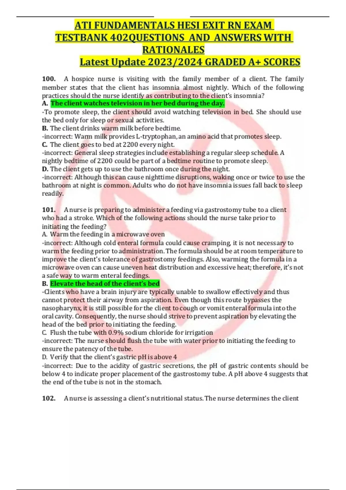 ATI FUNDAMENTALS HESI EXIT RN EXAM TESTBANK 402QUESTIONS AND ANSWERS WITH RATIONALES Latest Update 2023/2024 GRADED A+ SCORES