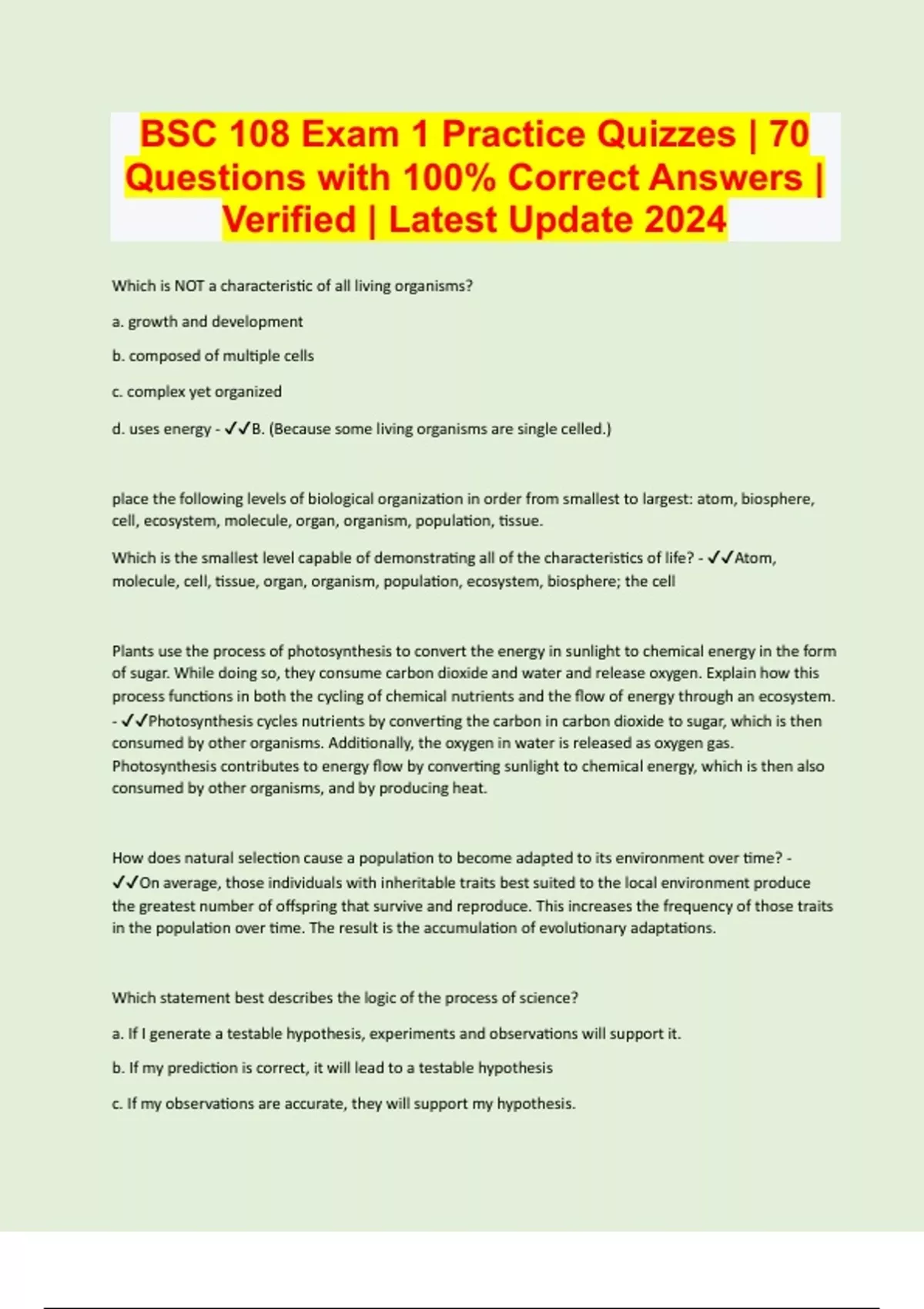 BSC 108 Exam 1 Practice Quizzes | 70 Questions with 100% Correct Answers | Verified | Latest Update 2024