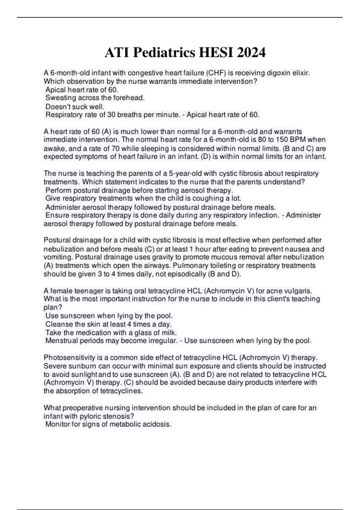 A 6-month-old infant with congestive heart failure (CHF) is receiving digoxin elixir. Which observation by the nurse warrants immediate intervention? Apical heart rate of 60. Sweating across the forehead. Doesn't suck well. Respiratory rate of 30 breaths per minute. - Apical heart rate of 60. A heart rate of 60 (A) is much lower than normal for a 6-month-old and warrants immediate intervention. The normal heart rate for a 6-month-old is 80 to 150 BPM when awake, and a rate of 70 while sleeping is considered within normal limits. (B and C) are expected symptoms of heart failure in an infant. (D) is within normal limits for an infant. The nurse is teaching the parents of a 5-year-old with cystic fibrosis about respiratory treatments. Which statement indicates to the nurse that the parents understand? Perform postural drainage before starting aerosol therapy. Give respiratory treatments when the child is coughing a lot. Administer aerosol therapy followed by postural drainage before meals. Ensure respiratory therapy is done daily during any respiratory infection. - Administer aerosol therapy followed by postural drainage before meals. Postural drainage for a child with cystic fibrosis is most effective when performed after nebulization and before meals (C) or at least 1 hour after eating to prevent nausea and vomiting. Postural drainage uses gravity to promote mucous removal after nebulization (A) treatments which open the airways. Pulmonary toileting or respiratory treatments should be given 3 to 4 times daily, not episodically (B and D). A female teenager is taking oral tetracycline HCL (Achromycin V) for acne vulgaris. What is the most important instruction for the nurse to include in this client's teaching plan? Use sunscreen when lying by the pool. Cleanse the skin at least 4 times a day. Take the medication with a glass of milk. Menstrual periods may become irregular. - Use sunscreen when lying by the pool. Photosensitivity is a common side effect of tetracycline HCL (Achromycin V) therapy. Severe sunburn can occur with minimal sun exposure and clients should be instructed to avoid sunlight and to use sunscreen (A). (B and D) are not related to tetracycline HCL (Achromycin V) therapy. (C) should be avoided because dairy products interfere with the absorption of tetracyclines. What preoperative nursing intervention should be includ