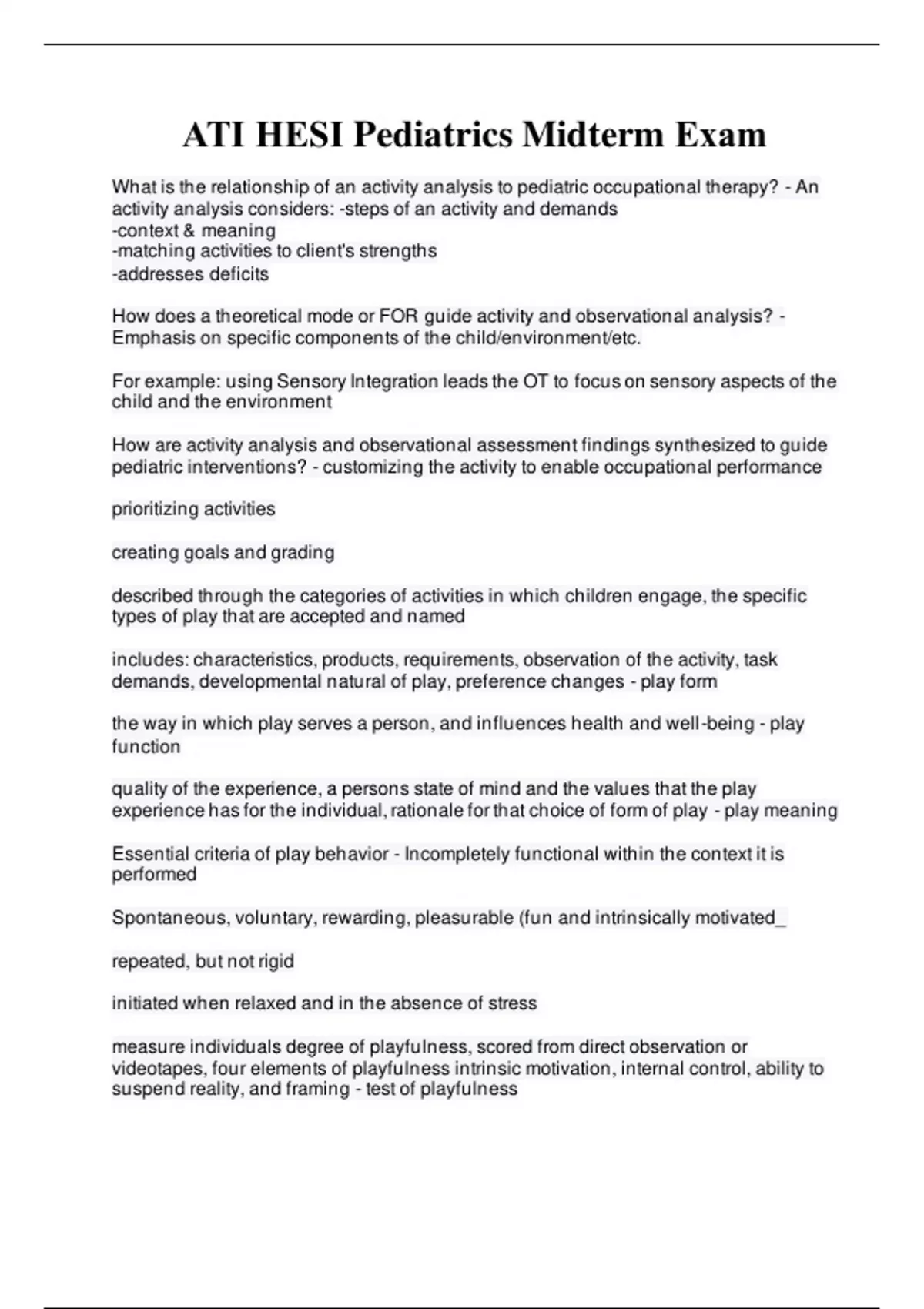 What is the relationship of an activity analysis to pediatric occupational therapy? - An activity analysis considers: -steps of an activity and demands -context & meaning -matching activities to client's strengths -addresses deficits How does a theoretical mode or FOR guide activity and observational analysis? - Emphasis on specific components of the child/environment/etc. For example: using Sensory Integration leads the OT to focus on sensory aspects of the child and the environment How are activity analysis and observational assessment findings synthesized to guide pediatric interventions? - customizing the activity to enable occupational performance prioritizing activities creating goals and grading described through the categories of activities in which children engage, the specific types of play that are accepted and named includes: characteristics, products, requirements, observation of the activity, task demands, developmental natural of play, preference changes - play form the way in which play serves a person, and influences health and well-being - play function quality of the experience, a persons state of mind and the values that the play experience has for the individual, rationale for that choice of form of play - play meaning Essential criteria of play behavior - Incompletely functional within the context it is performed Spontaneous, voluntary, rewarding, pleasurable (fun and intrinsically motivated_