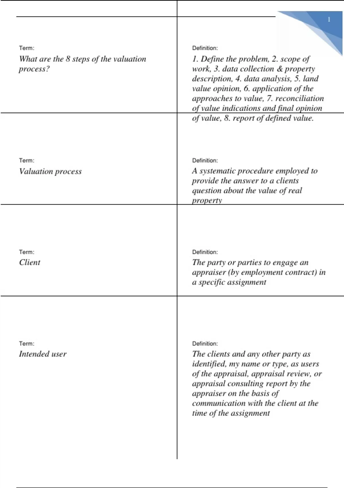 Term: What are the 8 steps of the valuation process? Definition: 1. Define the problem, 2. scope of work, 3. data collection & property description, 4. data analysis, 5. land value opinion, 6. application of the approaches to value, 7. reconciliation of value indications and final opinion of value, 8. report of defined value. Term: Valuation process Definition: A systematic procedure employed to provide the answer to a clients question about the value of real property Term: Client Definition: The party or parties to engage an appraiser (by employment contract) in a specific assignment Term: Intended user Definition: The clients and any other party as identified, my name or type, as users of the appraisal, appraisal review, or appraisal consulting report by the appraiser on the basis of communication with the client at the time of the assignment Term: Who determines who the intended users will be? Definition: The client Term: Intended use Definition: That use or uses of an appraiser reported appraisal, appraisal review, or appraisal consulting assignment opinions and conclusions, as identified by the appraiser based on communication with the client at the time of the assignment Term: Purpose of the appraisal Definition: The stated reason for an appraisal assignment, i.e., to develop an opinion of the defined value of any real property interest Term: Current date of value Definition: The effective date is contemporaneous with the date of the report Term: Retrospective date of value Definition: Effective date in the past Term: Prospective date of value Definition: A future date Term: Extraordinary assumptions Definition: That assumption, directly related to a specific assignment, which, if found to be false, but alter the appraisers opinions or conclusions. Extraordinary assumptions presume as fact otherwise uncertain information about... The property. Term: Hypothetical conditions Definition: This is a condition that is contrary to what exists but is supposed for the purpose of analysis Term: Scope of work Definition: The amount and type of information researched and the analysis applied in an appraisal assignment Term: General data Definition: Items of information on value influences that derived from social call me economic, governmental, and environmental forces and originate outside the property being appraised Term: Specific data Definition: Details about the property being appraised, comparable sale and rental properties, and relevant local market characteristics Term: Trend Definition: A series of related changes brought about by a chain of causes and effects. Trends are forecasted through economic base analysis, statistical analysis, market analysis, and analysis of economic indicators and surveys Term: Comparables Definition: A short term for similar property sales, rentals, operating expenses used for comparison and evaluation process; also called comps Term: Market analysis Definition: The identification and study of the market for a particular economic good or service Term: Highest and best use Definition: The reasonably probable and legal use of vacant land or an improved property, which is physically possible, appropriately supported, financially feasible, and that results in the highest value. The four criteria the highest and best use must meet are legal permissibility, physical possibility, financial feasibility, and maximum productivity Term: Land Definition: Either unimproved or improved land Term: Improved land Definition: Considered as being prepared for development by grading, draining, installing street and utilities, etc. Term: Site Definition: Commonly refers to improved so that does not require further land development or subdivision. It is ready for property improvements suited to its highest and best use e.g. a building site Term: Examples of analytical methods that require land value separate from the total property value? Definition: The cost approach, income capitalization involving residual techniques, highest and best use analysis as though vacant Term: What are the six procedures for analyzing land or site value? Definition: Sales comparison approach, extraction, allocation, land residual technique, ground rent capitalization, subdivision development Term: Sales comparison approach for vacant parcels Definition: The appraiser searches for sales of similar vacant parcels. The sale is analyzed and compared to the subject parcel and then adjusted for salient differences, this approach is the most common and preferred method of valuing land, assuming sufficient data is available Term: Extraction Definition: Sales price minus depreciated cost equals land value. When they get sales are unavailable, the appraiser analyze improve property sales similar to subject in land characteristics. The appraiser forms an opinion of the land value by subtracting the depreciated cost of the improvements from the sale price. When procedures applied, it can provide reliable data to assist the appraiser informing about your opinion on the appraised of land. However it will sales should be used, and the appraiser must be experienced in the use of cost and appreciated methodology. This procedure is most applicable when improvements can be reliably valued, such as when the improvements are either new or very old Term: Allocation Definition: The appraiser analyzes improved property sales and allocates prices paid between the land in total property, usually on a ratio basis (ex the structure is 80% the land is 20%). Term: Land residual technique Definition: requires the appraiser to separate the rent between the land and the improvements Term: Ground rent capitalization Definition: the land rent is a no amount, as in a land lease. In other cases the rent is primarily attributable to the land new doing in room use. Example is a surface parking lot in a downtown urban area. The appraiser divides the net amount estimated for the right to use and occupy the land by a land capitalization r