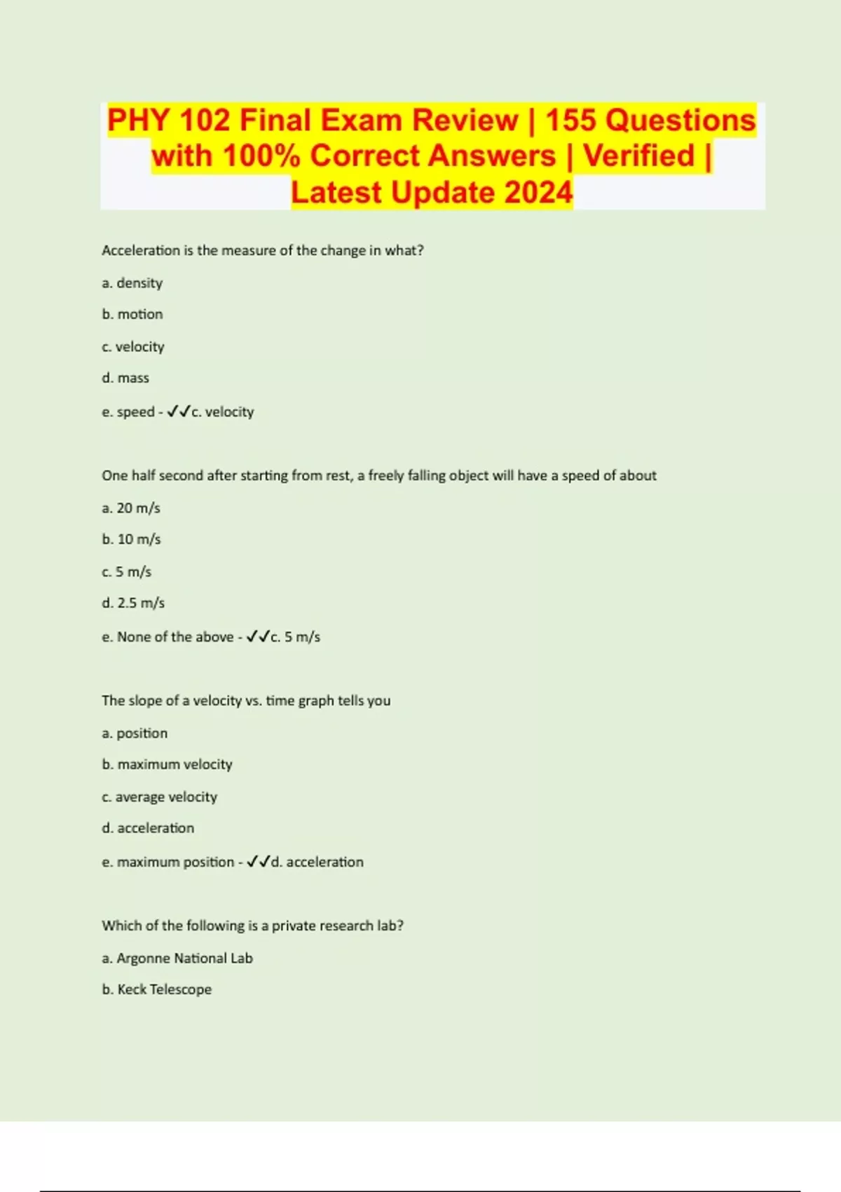 PHY 102 Final Exam Review | 155 Questions with 100% Correct Answers | Verified | Latest Update 2024