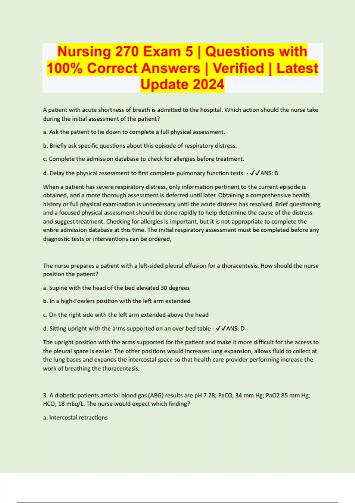 A patient with acute shortness of breath is admitted to the hospital. Which action should the nurse take during the initial assessment of the patient? a. Ask the patient to lie down to complete a full physical assessment. b. Briefly ask specific questions about this episode of respiratory distress. с. Complete the admission database to check for allergies before treatment. d. Delay the physical assessment to first complete pulmonary function tests. - ANS: B When a patient has severe respiratory distress, only information pertinent to the current episode is obtained, and a more thorough assessment is deferred until later. Obtaining a comprehensive health history or full physical examination is unnecessary until the acute distress has resolved. Brief questioning and a focused physical assessment should be done rapidly to help determine the cause of the distress and suggest treatment. Checking for allergies is important, but it is not appropriate to complete the entire admission database at this time. The initial respiratory assessment must be completed before any diagnostic tests or interventions can be ordered, The nurse prepares a patient with a left-sided pleural effusion for a thoracentesis. How should the nurse position the patient? a. Supine with the head of the bed elevated 30 degrees b. In a high-Fowlers position with the left arm extended с. On the right side with the left arm extended above the head d. Sitting upright with the arms supported on an over bed table - ANS: D