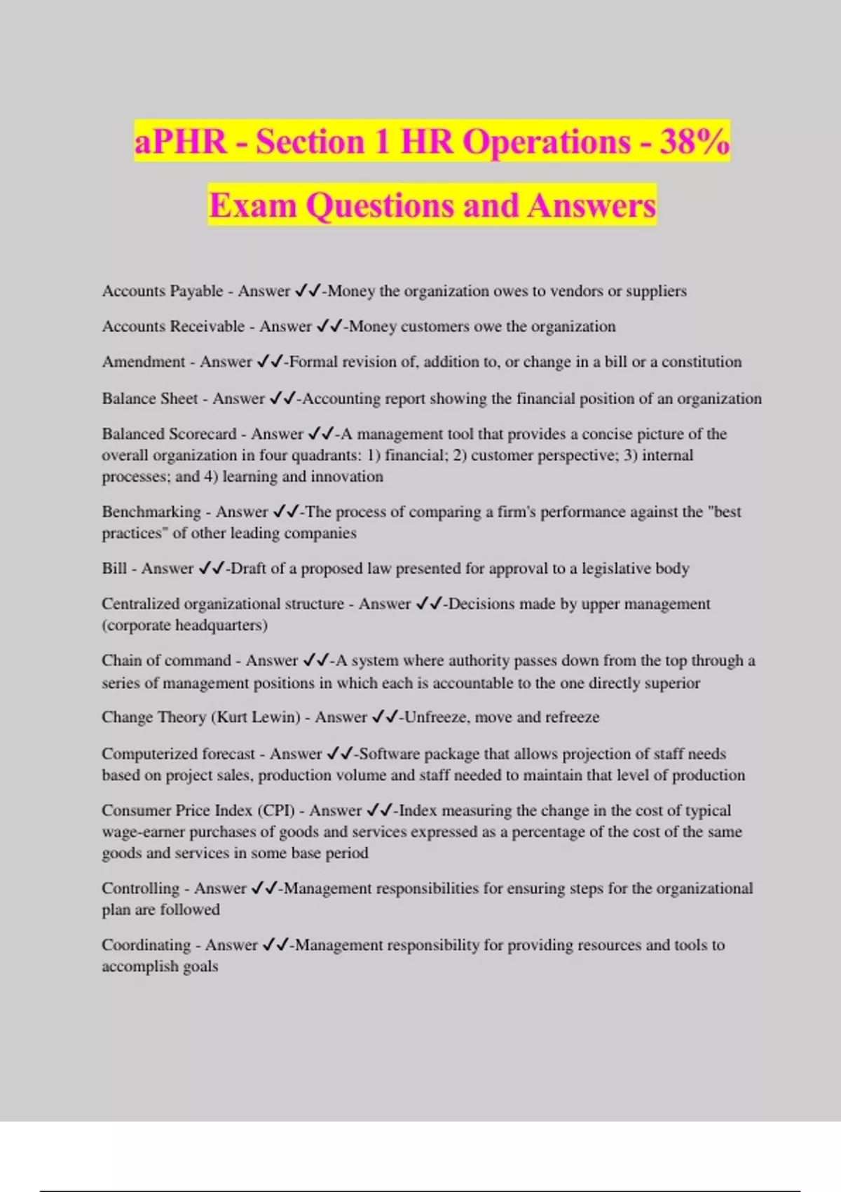aPHR - Section 1 HR Operations - 38% Exam Questions and Answers Accounts Payable - Answer ️️ -Money the organization owes to vendors or suppliers Accounts Receivable - Answer ️️ -Money customers owe the organization Amendment - Answer ️️ -Formal revision of, addition to, or change in a bill or a constitution Balance Sheet - Answer ️️ -Accounting report showing the financial position of an organization Balanced Scorecard - Answer ️️ -A management tool that provides a concise picture of the overall organization in four quadrants: 1) financial; 2) customer perspective; 3) internal processes; and 4) learning and innovation Benchmarking - Answer ️️ -The process of comparing a firm's performance against the "best practices" of other leading companies Bill - Answer ️️ -Draft of a proposed law presented for approval to a legislative body Centralized organizational structure - Answer ️️ -Decisions made by upper management (corporate headquarters) Chain of command - Answer ️️ -A system where authority passes down from the top through a series of management positions in which each is accountable to the one directly superior Change Theory (Kurt Lewin) - Answer ️️ -Unfreeze, move and refreeze Computerized forecast - Answer ️️ -Software package that allows projection of staff needs based on project sales, production volume and staff needed to maintain that level of production Consumer Price Index (CPI) - Answer ️️ -Index measuring the change in the cost of typical wage-earner purchases of goods and services expressed as a percentage of the cost of the same goods and services in some base period Controlling - Answer ️️ -Management responsibilities for ensuring steps for the organizational plan are followed Coordinating - Answer ️️ -Management responsibility for providing resources and tools to accomplish goals
