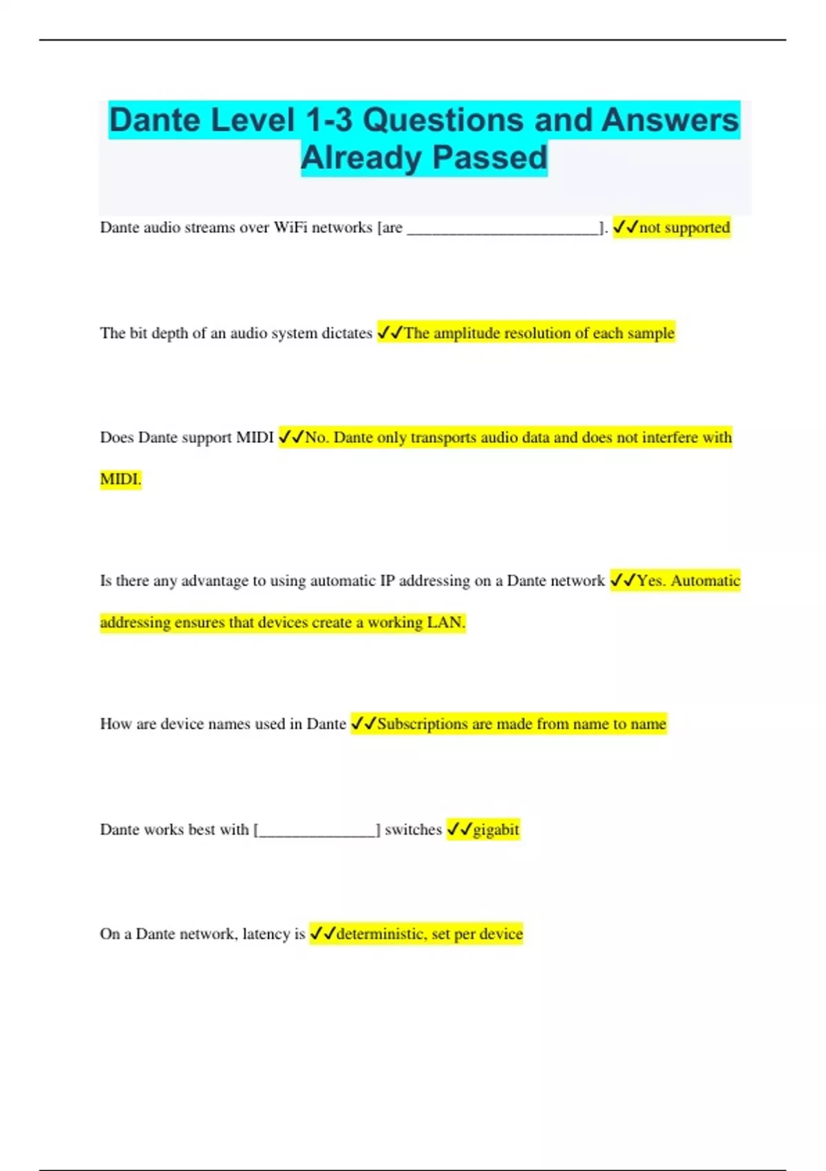 Dante Level 1-3 Questions and Answers Already Passed Dante audio streams over WiFi networks [are _______________________]. not supported The bit depth of an audio system dictates The amplitude resolution of each sample Does Dante support MIDI No. Dante only transports audio data and does not interfere with MIDI. Is there any advantage to using automatic IP addressing on a Dante network Yes. Automatic addressing ensures that devices create a working LAN. How are device names used in Dante Subscriptions are made from name to name Dante works best with [______________] switches gigabit On a Dante network, latency is deterministic, set per device As sample rate is increased on a device, what other property is usually changed Channel count is reduced Where do Dante settings reside? On individual Dante devices In the Dante Controller Routing tab, a green check mark indicates Subscription successful Which of the following are diagnostic features of Dante Controller? (check all that apply) 1. Latency monitoring 2. Clock monitoring How does Dante interact with Energy Efficient Ethernet (EEE) switches? EEE switches are not recommended for use with Dante When should fiber be used for an Ethernet connection? When runs over 100 meters are required. The easiest way to get IP addresses for a functional stand-alone Dante network is for all devices and computers to Use the "obtain an IP Address Automatically" setting If a network is only used for Dante and has only one network switch, then The network does not require a managed switch Does Dante require special network cabling? Regular CAT5E or CAT6 Ethernet cable is recommended How are devices added to a Dante network Devices are automatically discovered and displayed in Dante Controller Dante uses [_________________________] switches. standard How are devices restored to a Dante network after power cycle Devices and connections are automatically restored What
