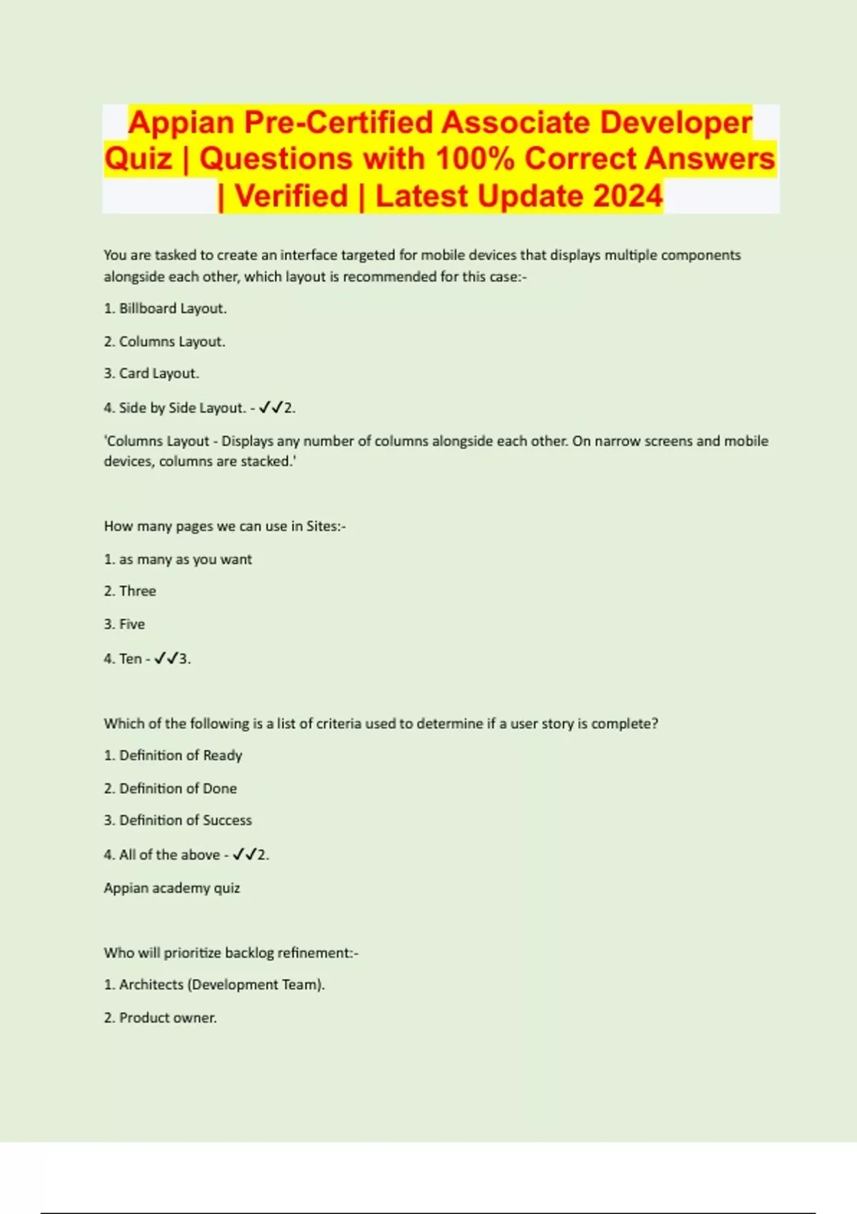 You are tasked to create an interface targeted for mobile devices that displays multiple components alongside each other, which layout is recommended for this case:- 1. Billboard Layout. 2. Columns Layout. 3. Card Layout. 4. Side by Side Layout. - 2. 'Columns Layout - Displays any number of columns alongside each other. On narrow screens and mobile devices, columns are stacked.' How many pages we can use in Sites:- 1. as many as you want 2. Three 3. Five 4. Ten - 3. Which of the following is a list of criteria used to determine if a user story is complete? 1. Definition of Ready 2. Definition of Done 3. Definition of Success 4. All of the above - 2. Appian academy quiz