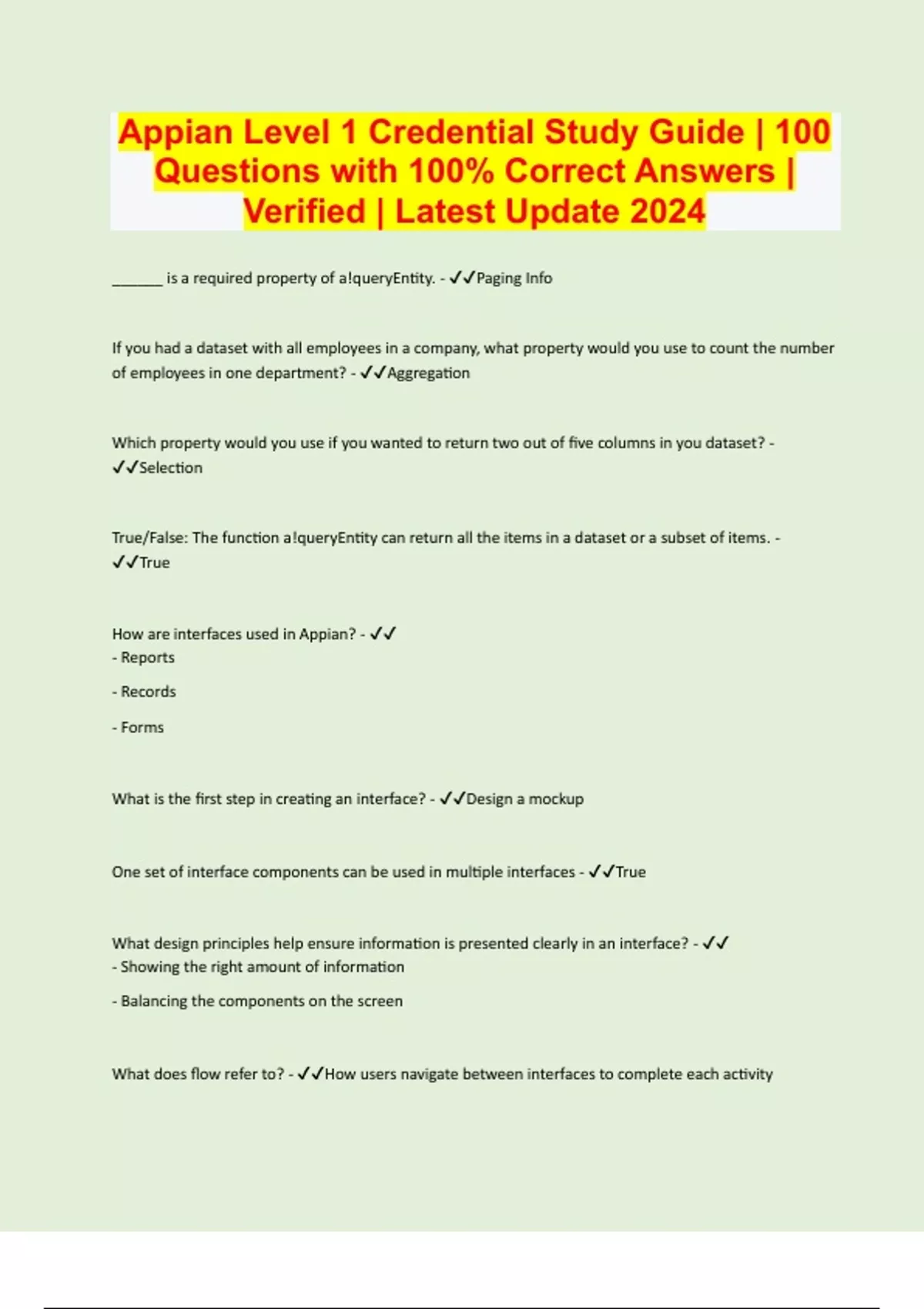 Appian Level 1 Credential Study Guide | 100 Questions with 100% Correct Answers | Verified | Latest Update 2024