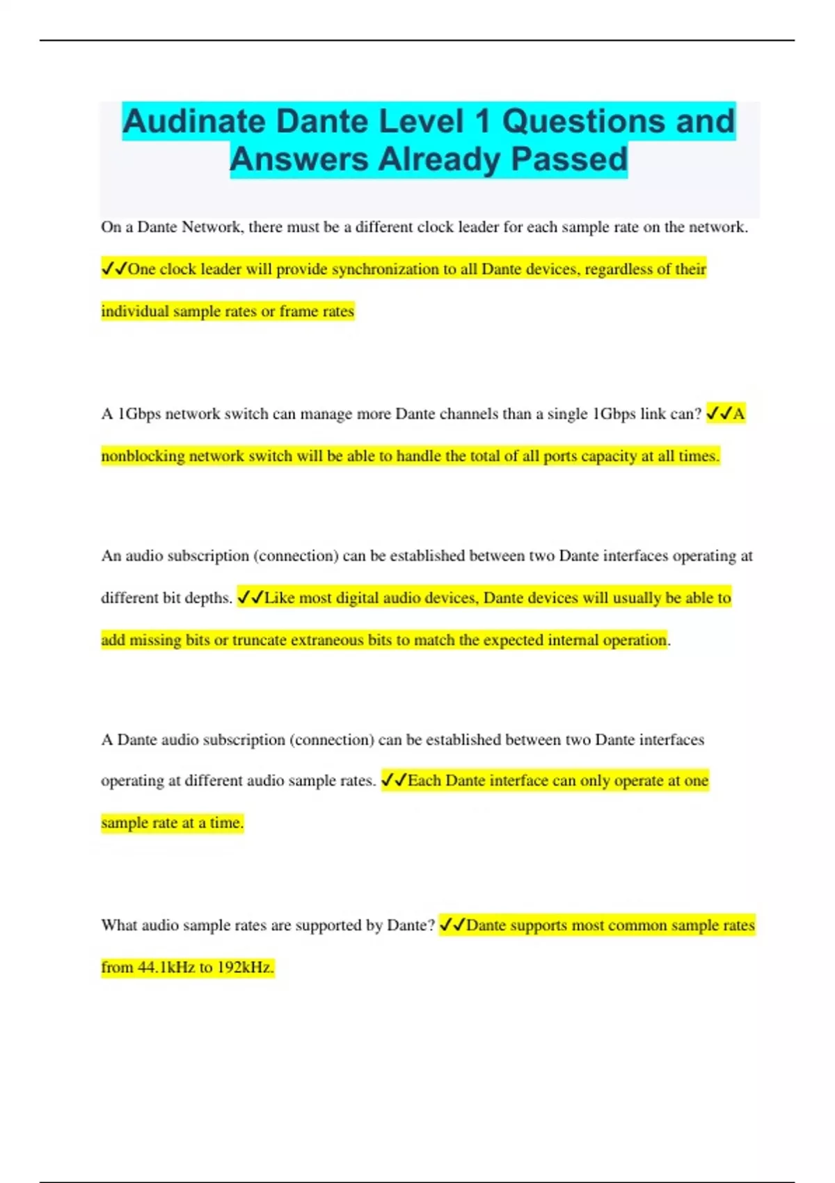 Audinate Dante Level 1 Questions and Answers Already Passed
