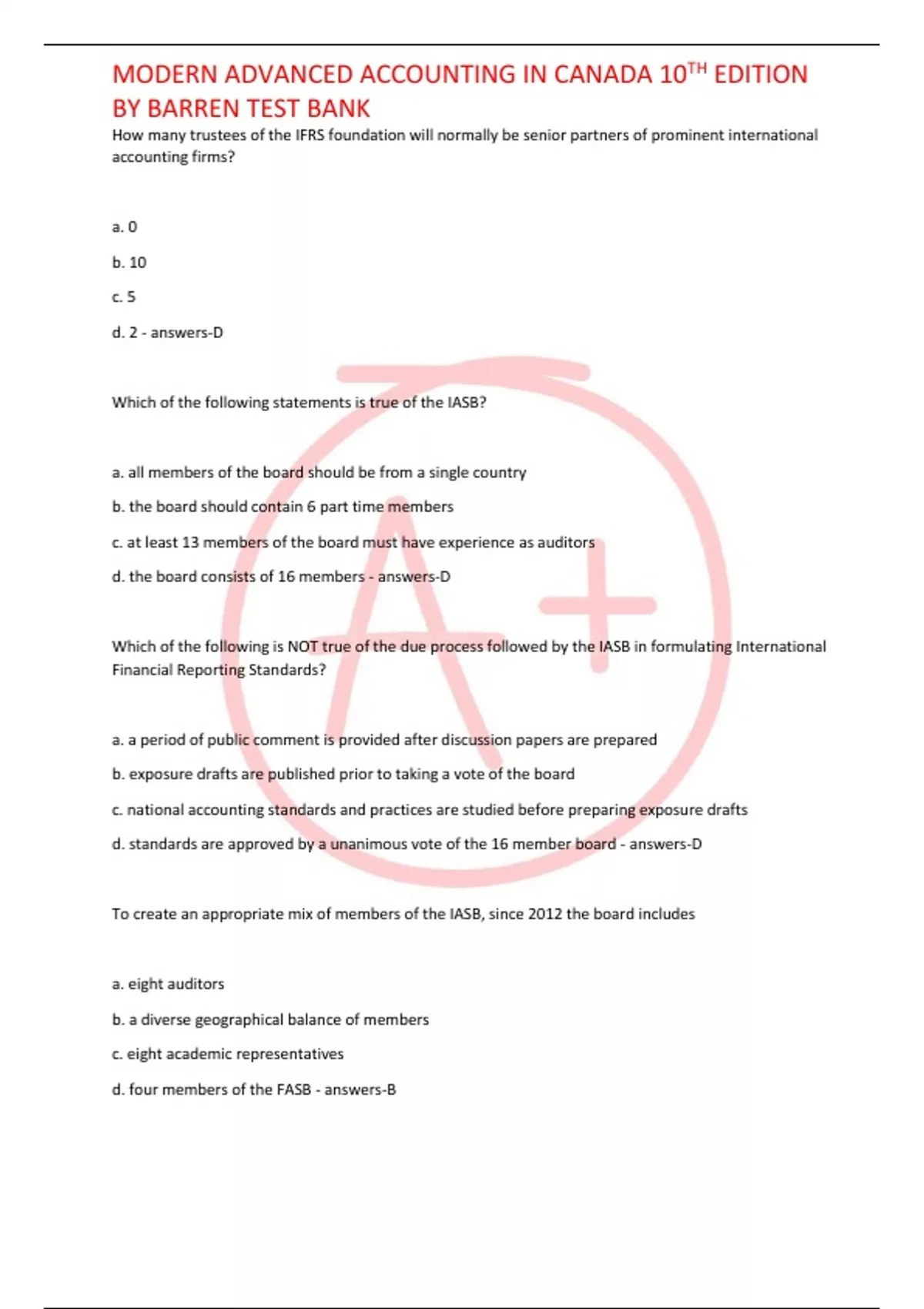 How many trustees of the IFRS foundation will normally be senior partners of prominent international accounting firms? a. 0 b. 10 c. 5 d. 2 - answers-D Which of the following statements is true of the IASB? a. all members of the board should be from a single country b. the board should contain 6 part time members c. at least 13 members of the board must have experience as auditors d. the board consists of 16 members - answers-D Which of the following is NOT true of the due process followed by the IASB in formulating International Financial Reporting Standards? a. a period of public comment is provided after discussion papers are prepared b. exposure drafts are published prior to taking a vote of the board c. national accounting standards and practices are studied before preparing exposure drafts d. standards are approved by a unanimous vote of the 16 member board - answers-D To create an appropriate mix of members of the IASB, since 2012 the board includes