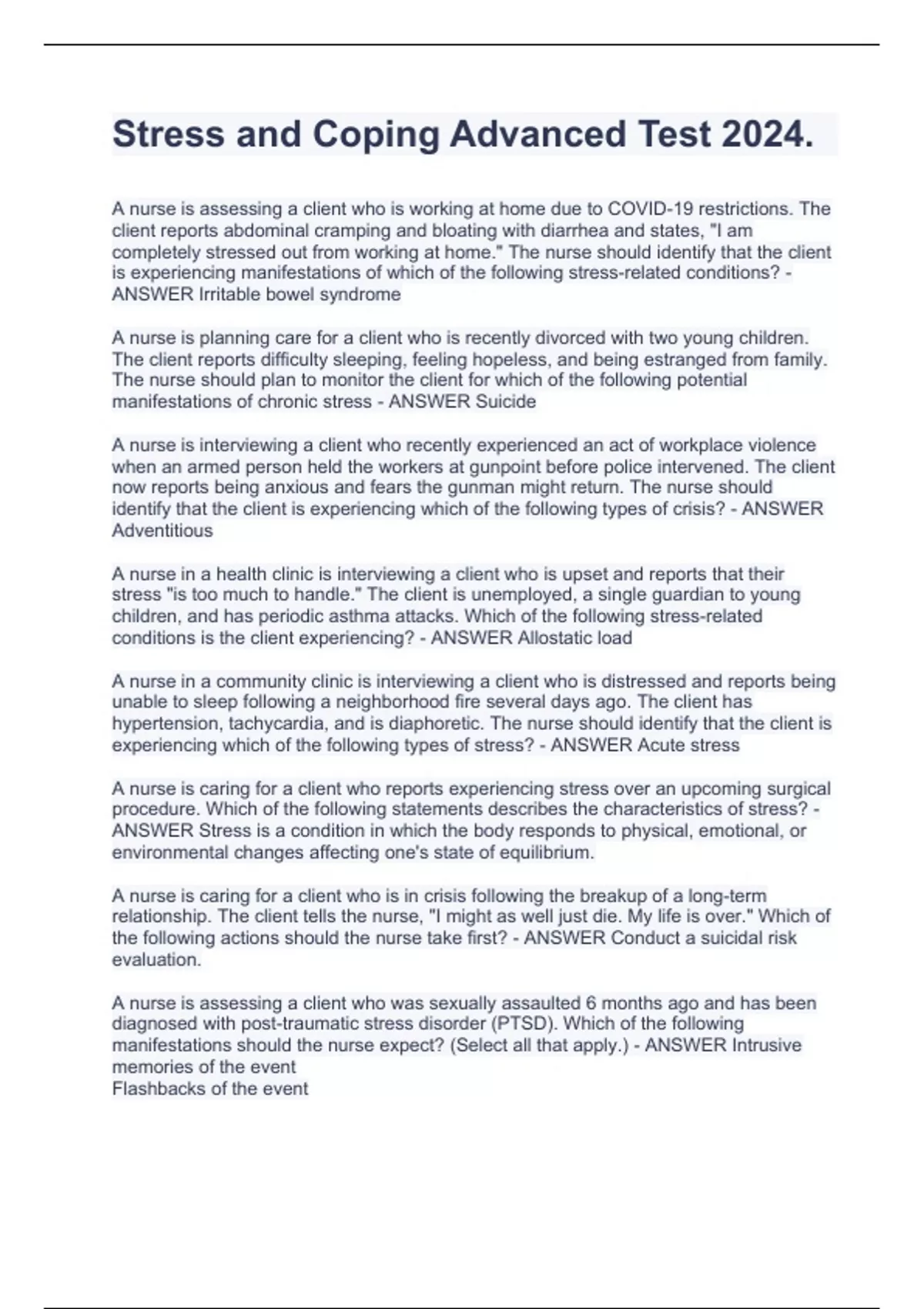 Stress and Coping Advanced Test 2024.A nurse is assessing a client who is working at home due to COVID-19 restrictions. The client reports abdominal cramping and bloating with diarrhea and states, "I am completely stressed out from working at home." The nurse should identify that the client is experiencing manifestations of which of the following stress-related conditions? - ANSWER Irritable bowel syndrome A nurse is planning care for a client who is recently divorced with two young children. The client reports difficulty sleeping, feeling hopeless, and being estranged from family. The nurse should plan to monitor the client for which of the following potential manifestations of chronic stress - ANSWER Suicide A nurse is interviewing a client who recently experienced an act of workplace violence when an armed person held the workers at gunpoint before police intervened. The client now reports being anxious and fears the gunman might return. The nurse should identify that the client is experiencing which of the following types of crisis? - ANSWER Adventitious