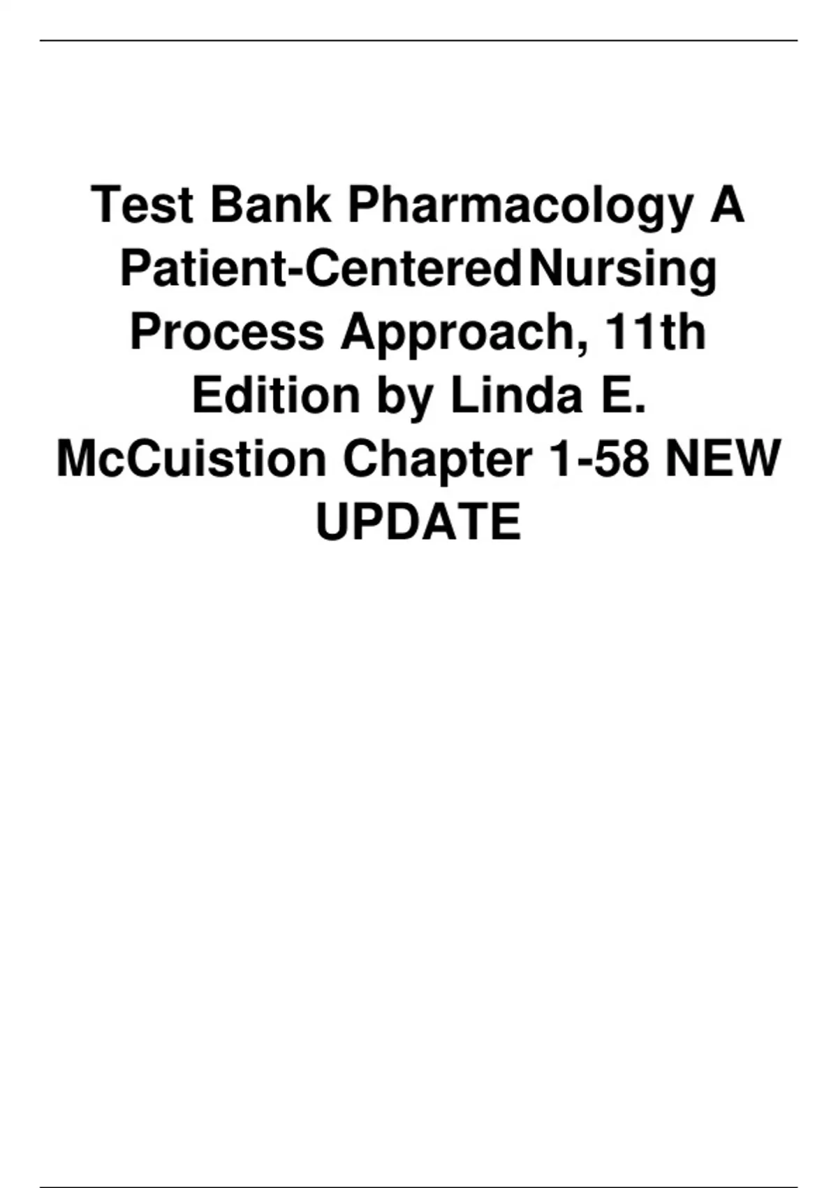 Chapter 01: The Nursing Process and Patient-Centered Care McCuistion: Pharmacology: A Patient-Centered Nursing Process Approach, 11th Edition MULTIPLE CHOICE 1. All of the following would be considered subjective data, EXCEPT: a. Patient-reported health history b. Patient-reported signs and symptoms of their illness c. Financial barriers reported by the patient’s caregiver d. Vital signs obtained from the medical record ANS: D Subjective data is based on what patients or family members communicate to the nurse. Patient-reported health history, signs and symptoms, and caregiver reported financial barriers would be considered subjective data. Vital signs obtained from the medical record would be considered objective data. DIF: Cognitive Level: Understanding (Comprehension) TOP: Nursing Process: PlanningMSC: NCLEX: Management of Client Care 2. The nurse is using data collected to define a set of interventions to achieve the most desirableoutcomes. Which of the following steps is the nurse applying? a. Recognizing cues (assessment) b. Analyze cues & prioritize hypothesis (analysis) c. Generate solutions (planning) d. Take action (nursing interventions) ANS: C When generating solutions (planning), the nurse identifies expected outcomes and uses the patient’s problem(s) to define a set of interventions to achieve the most desirable outcomes. Recognizing cues (assessment) involves the gathering of cues (information) from the patient about their health and lifestyle practices, which are important facts that aid the nurse in making clinical care decisions. Prioritizing hypothesis is used to organize and rank the patient problem(s)identified. Finally, taking action involves implementation of nursing interventions to accomplish the expected outcomes. DIF: Cognitive Level: Understanding (Comprehension)TOP: Nursing Process: Nursing Intervention MSC: NCLEX: Management of Client Care 3. A 5-year-old child with type 1 diabetes mellitus has had repeated hospitalizations for episodes ofhyperglycemia. The parents tell the nurse that they can’t keep track of everything that has to be done to care for their child. The nurse reviews medications, diet, and symptom management withthe parents and draws up a daily checklist for the family to use. These activities are completed inwhich step of the nursing process? a. Recognizing cues (assessment) b. Analyze cues & prioritize hypothesis (analysis) c. Generate solutions (planning) d. Take action (nursing interventions) ANS: D Taking action through nursing interventions is where the nurse provides patient health teaching,drug administration, patient care, and other interventions necessary to assist the patient in accomplishing expected outcomes. DIF: Cognitive Level: Understanding (Comprehension)TOP: Nursing Process: Nursing Intervention MSC: NCLEX: Management of Client Care 4. The nurse is preparing to administer a medication and reviews the patient’s chart for drug allergies, serum creatinine, and blood urea nitrogen (BUN) levels. The nurse’s actions arereflective of which of the following? a. Recognizing cues (assessment) b. Analyze cues & prioritize hypothesis (analysis) c. Take action (nursing interventions) d. Generate solutions (planning) ANS: A Recognizing cues (assessment) involves gathering subjective and objective information about thepatient and the medication. Laboratory values from the patient’s chart would be considered collection of objective data. DIF: Cognitive Level: Understanding (Comprehension) TOP: Nursing Process: Assessment MSC: NCLEX: Management of Client Care 5. Which of the following would be correctly categorized as objective data? a. A list of herbal supplements regularly used provided by the patient. b. Lab values associated with the drugs the patient is taking. c. The ages and relationship of all household members to the patient. d. Usual dietary patterns and food intake. ANS: B Objective data are measured and detected by another person and would include lab values. Theother examples are subjective data. DIF: Cognitive Level: Understanding (Comprehension) TOP: Nursing Process: Assessment MSC: NCLEX: Management of Client Care 6. The nurse reviews a patient’s database and learns that the patient lives alone, is forgetful, and does not have an established routine. The patient will be sent home with three new medications to be taken at different times of the day. The nurse develops a daily medication chart and enlistsa family member to put the patient’s pills in a pill organizer. This is an example of which element of the nursing process? a. Recognizing cues (assessment) b. Analyze cues & prioritize hypothesis (analysis) c. Take action (nursing interventions) d. Generate solutions (planning) ANS: C Taking action (nursing interventions) involves education and patient care in order to assist thepatient to accomplish the goals of treatment. DIF: Cognitive Level: Applying (Application)TOP: Nursing Process: Nursing Intervention MSC: NCLEX: Management of Client Care 7. A patient who is hospitalized for chronic obstructive pulmonary disease (COPD) wants to go home. The nurse and the patient discuss the patient’s situation and decide that the patient may gohome when able to perform self-care without dyspnea and hypoxia. This is an example of which phase of the nursing process? a. Recognizing cues (assessment) b. Analyze cues & prioritize hypothesis (analysis) c. Take action (nursing interventions) d. Generate solutions (planning) ANS: D Generating solutions (planning) involves defining a set of interventions to achieve the most desirable outcomes, which, for this patient, means being able to perform self-care activitieswithout dyspnea and hypoxia. DIF: Cognitive Level: Understanding (Comprehension) TOP: Nursing Process: PlanningMSC: NCLEX: Management of Client Care 8. A patient will be sent home with a metered-dose inhaler, and the nurse is providing teaching.Which is a correctly written expected outcome for this process? a. The n