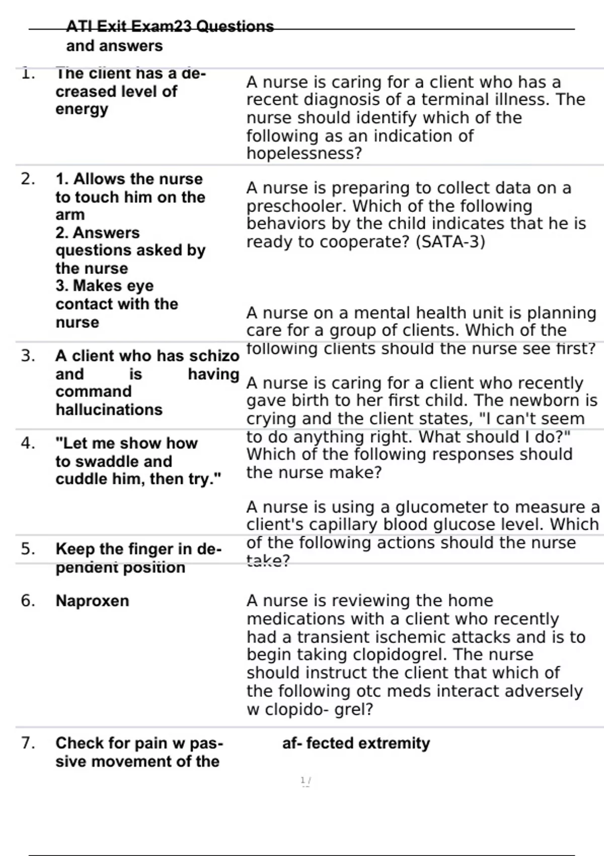 1. The client has a de- creased level of energy 2. 1. Allows the nurse to touch him on the arm 2. Answers questions asked by the nurse 3. Makes eye contact with the nurse 3. A client who has schizo and is having command hallucinations 4. "Let me show how to swaddle and cuddle him, then try." 5. Keep the finger in de- pendent position
