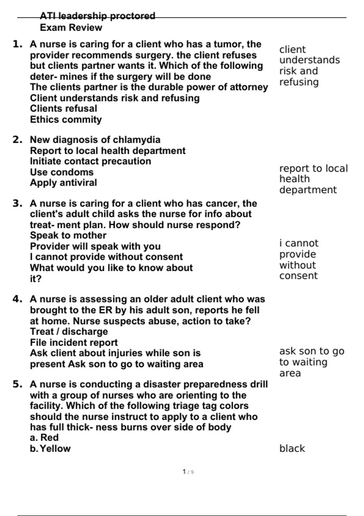 1. A nurse is caring for a client who has a tumor, the provider recommends surgery. the client refuses but clients partner wants it. Which of the following deter- mines if the surgery will be done The clients partner is the durable power of attorney Client understands risk and refusing Clients refusal Ethics commity 2. New diagnosis of chlamydia Report to local health department Initiate contact precaution Use condoms Apply antiviral 3. A nurse is caring for a client who has cancer, the client's adult child asks the nurse for info about treat- ment plan. How should nurse respond? Speak to mother Provider will speak with you I cannot provide without consent What would you like to know about it? 4. A nurse is assessing an older adult client who was brought to the ER by his adult son, reports he fell at home. Nurse suspects abuse, action to take? Treat / discharge File incident report Ask client about injuries while son is present Ask son to go to waiting area 5. A nurse is conducting a disaster preparedness drill with a group of nurses who are orienting to the facility. Which of the following triage tag colors should the nurse instruct to apply to a client who has full thick- ness burns over side of body a. Red b. Yellow