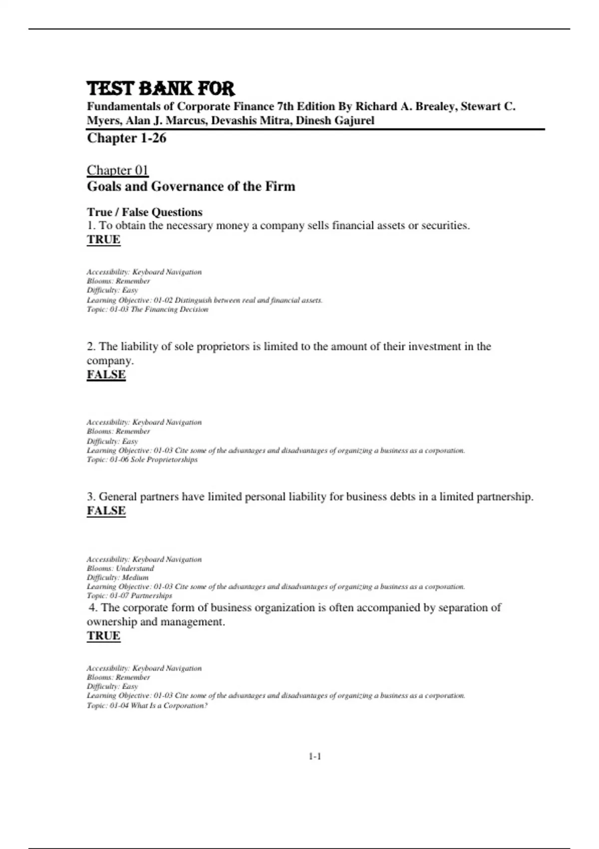 Test Bank for Fundamentals of Corporate Finance 7th Edition By Richard A. Brealey, Stewart C. Myers, Alan J. Marcus, Devashis Mitra, Dinesh Gajurel