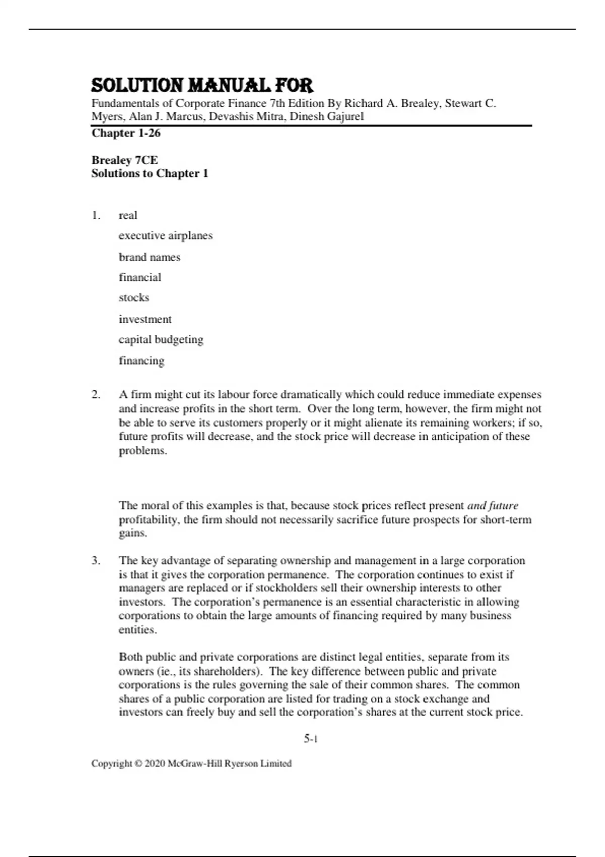Solution Manual for Fundamentals of Corporate Finance 7th Edition By Richard A. Brealey, Stewart C. Myers, Alan J. Marcus, Devashis Mitra, Dinesh Gajurel