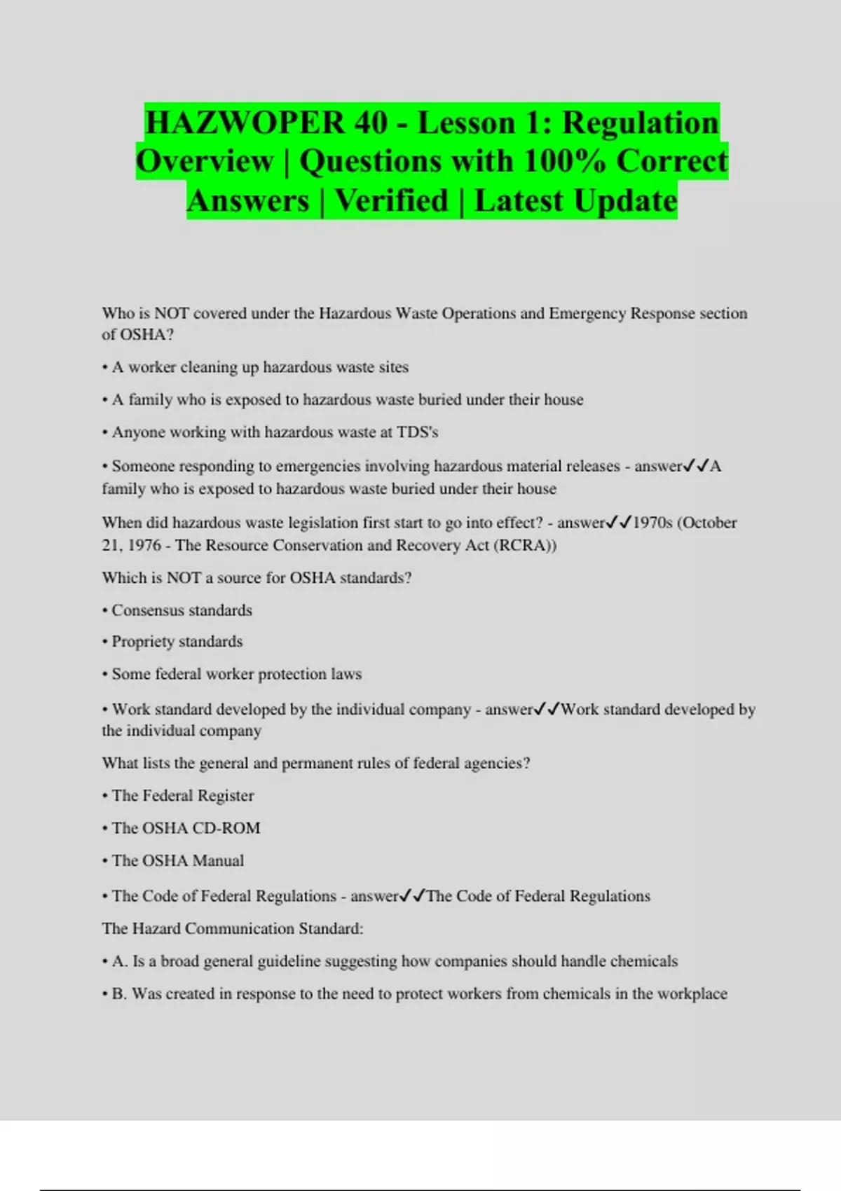 HAZWOPER 40 - Lesson 1: Regulation Overview | Questions with 100% Correct Answers | Verified | Latest Update