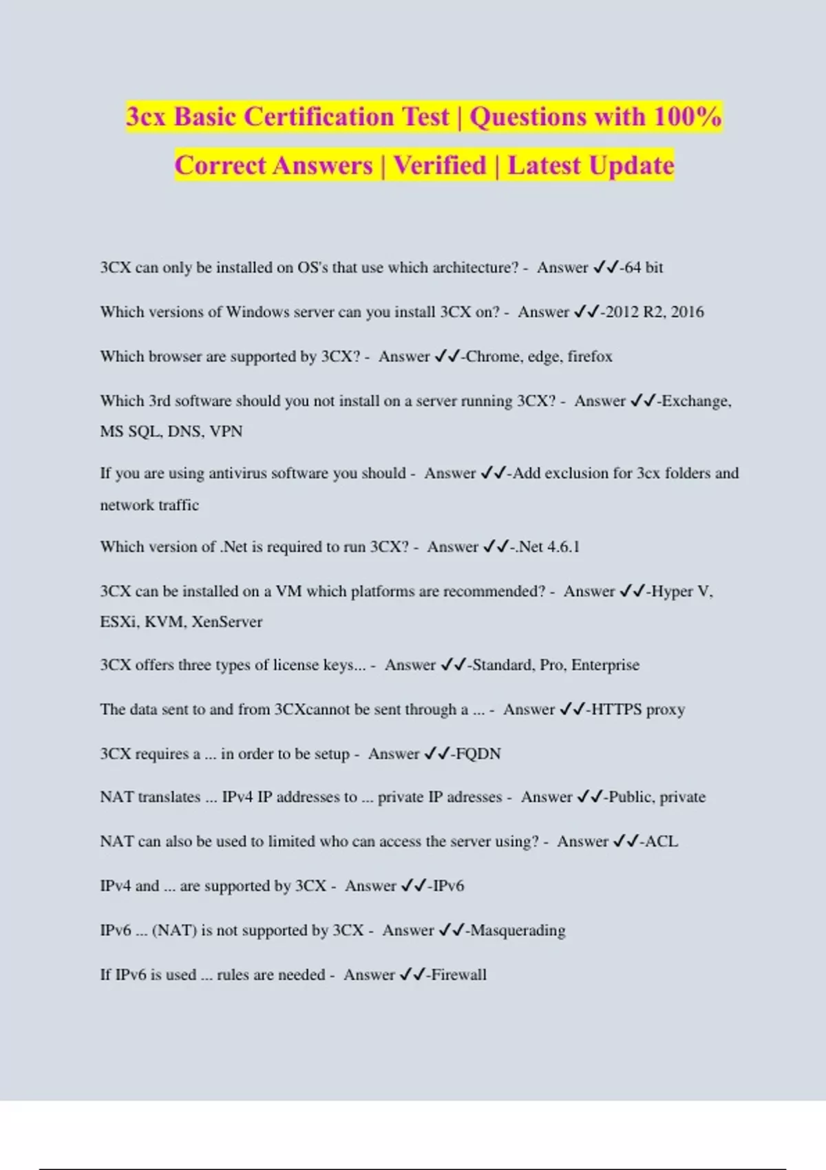 3CX Academy, Basic Certification, Install 3CX Questions with 100% Correct Answers| Latest Update