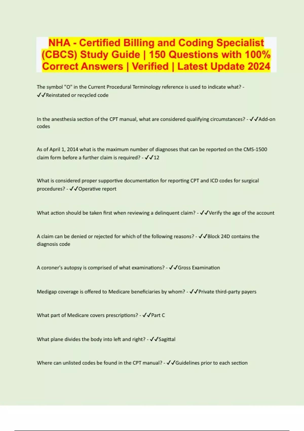 NHA - Certified Billing and Coding Specialist (CBCS) Study Guide | 150 Questions with 100% Correct Answers | Verified | Latest Update 2024