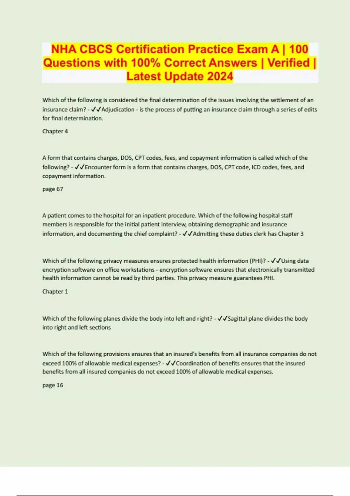 NHA CBCS Certification Practice Exam A | 100 Questions with 100% Correct Answers | Verified | Latest Update 2024