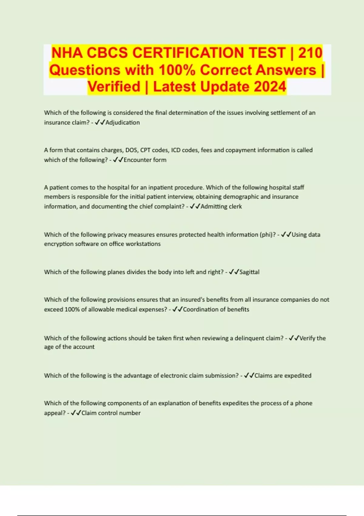 NHA CBCS CERTIFICATION TEST | 210 Questions with 100% Correct Answers | Verified | Latest Update 2024