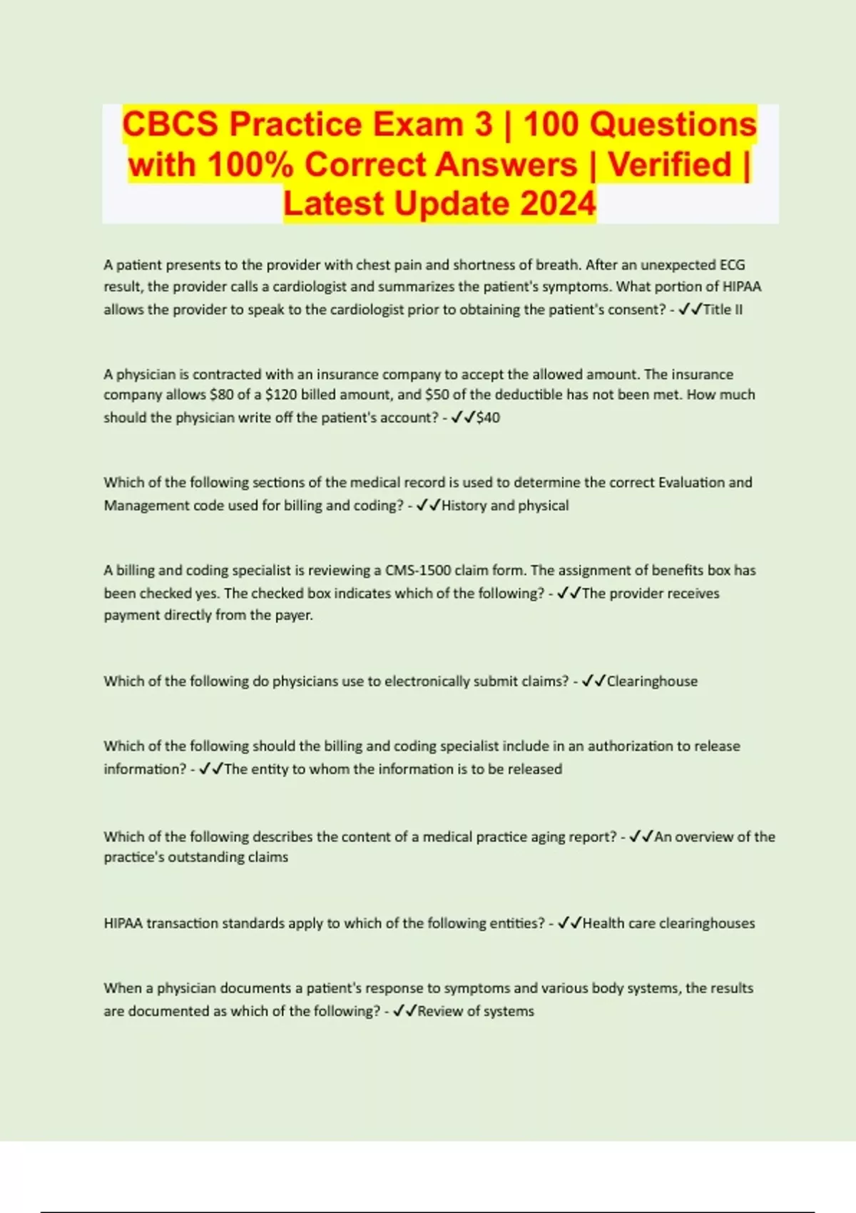 A patient presents to the provider with chest pain and shortness of breath. After an unexpected ECG result, the provider calls a cardiologist and summarizes the patient's symptoms. What portion of HIPAA allows the provider to speak to the cardiologist prior to obtaining the patient's consent? - Title II A physician is contracted with an insurance company to accept the allowed amount. The insurance company allows $80 of a $120 billed amount, and $50 of the deductible has not been met. How much should the physician write off the patient's account? - $40 Which of the following sections of the medical record is used to determine the correct Evaluation and Management code used for billing and coding? - History and physical A billing and coding specialist is reviewing a CMS-1500 claim form. The assignment of benefits box has been checked yes. The checked box indicates which of the following? - The provider receives payment directly from the payer. Which of the following do physicians use to electronically submit claims? - Clearinghouse