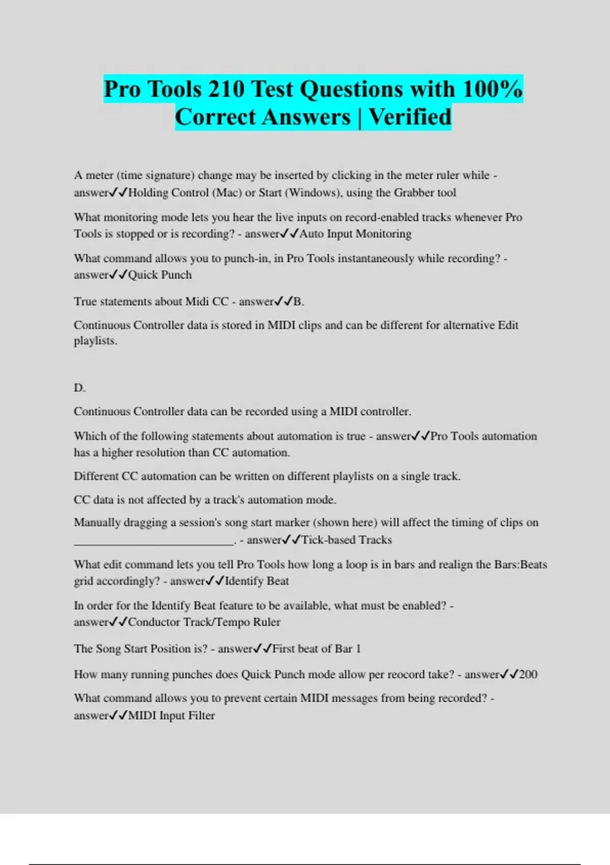Pro Tools 210 Test Questions with 100% Correct Answers | Verified A meter (time signature) change may be inserted by clicking in the meter ruler while - answerHolding Control (Mac) or Start (Windows), using the Grabber tool What monitoring mode lets you hear the live inputs on record-enabled tracks whenever Pro Tools is stopped or is recording? - answerAuto Input Monitoring What command allows you to punch-in, in Pro Tools instantaneously while recording? - answerQuick Punch True statements about Midi CC - answerB. Continuous Controller data is stored in MIDI clips and can be different for alternative Edit playlists. D. Continuous Controller data can be recorded using a MIDI controller. Which of the following statements about automation is true - answerPro Tools automation has a higher resolution than CC automation. Different CC automation can be written on different playlists on a single track. CC data is not affected by a track's automation mode. Manually dragging a session's song start marker (shown here) will affect the timing of clips on __________________________. - answerTick-based Tracks What edit command lets you tell Pro Tools how long a loop is in bars and realign the Bars:Beats grid accordingly? - answerIdentify Beat In order for the Identify Beat feature to be available, what must be enabled? - answerConductor Track/Tempo Ruler The Song Start Position is? - answerFirst beat of Bar 1 How many running punches does Quick Punch mode allow per reocord take? - answer200 What command allows you to prevent certain MIDI messages from being recorded? - answerMIDI Input Filte