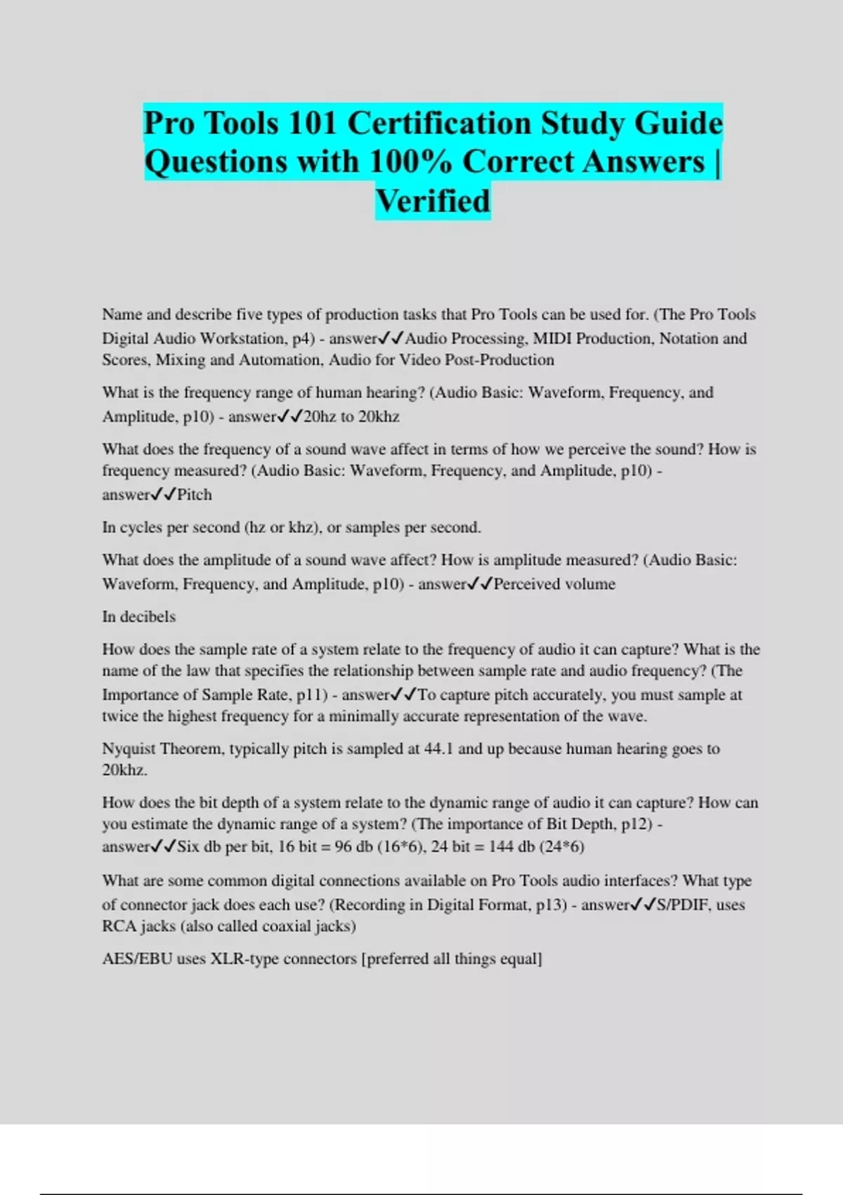 Pro Tools 101 Certification Study Guide Questions with 100% Correct Answers | Verified Name and describe five types of production tasks that Pro Tools can be used for. (The Pro Tools Digital Audio Workstation, p4) - answerAudio Processing, MIDI Production, Notation and Scores, Mixing and Automation, Audio for Video Post-Production What is the frequency range of human hearing? (Audio Basic: Waveform, Frequency, and Amplitude, p10) - answer20hz to 20khz What does the frequency of a sound wave affect in terms of how we perceive the sound? How is frequency measured? (Audio Basic: Waveform, Frequency, and Amplitude, p10) - answerPitch In cycles per second (hz or khz), or samples per second. What does the amplitude of a sound wave affect? How is amplitude measured? (Audio Basic: Waveform, Frequency, and Amplitude, p10) - answerPerceived volume In decibels How does the sample rate of a system relate to the frequency of audio it can capture? What is the name of the law that specifies the relationship between sample rate and audio frequency? (The Importance of Sample Rate, p11) - answerTo capture pitch accurately, you must sample at twice the highest frequency for a minimally accurate representation of the wave. Nyquist Theorem, typically pitch is sampled at 44.1 and up because human hearing goes to 20khz. How does the bit depth of a system relate to the dynamic range of audio it can capture? How can you estimate the dynamic range of a system? (The importance of Bit Depth, p12) - answerSix db per bit, 16 bit = 96 db (16*6), 24 bit = 144 db (24*6) What are some common digital connections available on Pro Tools audio interfaces? What type of connector jack does each use? (Recording in Digital Format, p13) - answerS/PDIF, uses RCA jacks (also called coaxial jacks) AES/EBU uses XLR-type connectors [preferred all things equa