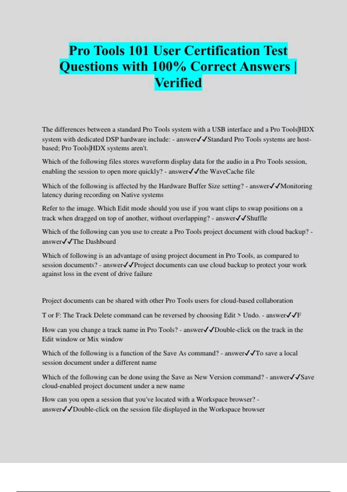 Pro Tools 101 User Certification Test Questions with 100% Correct Answers | Verified The differences between a standard Pro Tools system with a USB interface and a Pro Tools|HDX system with dedicated DSP hardware include: - answerStandard Pro Tools systems are host- based; Pro Tools|HDX systems aren't. Which of the following files stores waveform display data for the audio in a Pro Tools session, enabling the session to open more quickly? - answerthe WaveCache file Which of the following is affected by the Hardware Buffer Size setting? - answerMonitoring latency during recording on Native systems Refer to the image. Which Edit mode should you use if you want clips to swap positions on a track when dragged on top of another, without overlapping? - answerShuffle Which of the following can you use to create a Pro Tools project document with cloud backup? - answerThe Dashboard Which of following is an advantage of using project document in Pro Tools, as compared to session documents? - answerProject documents can use cloud backup to protect your work against loss in the event of drive failure Project documents can be shared with other Pro Tools users for cloud-based collaboration T or F: The Track Delete command can be reversed by choosing Edit > Undo. - answerF How can you change a track name in Pro Tools? - answerDouble-click on the track in the Edit window or Mix windo