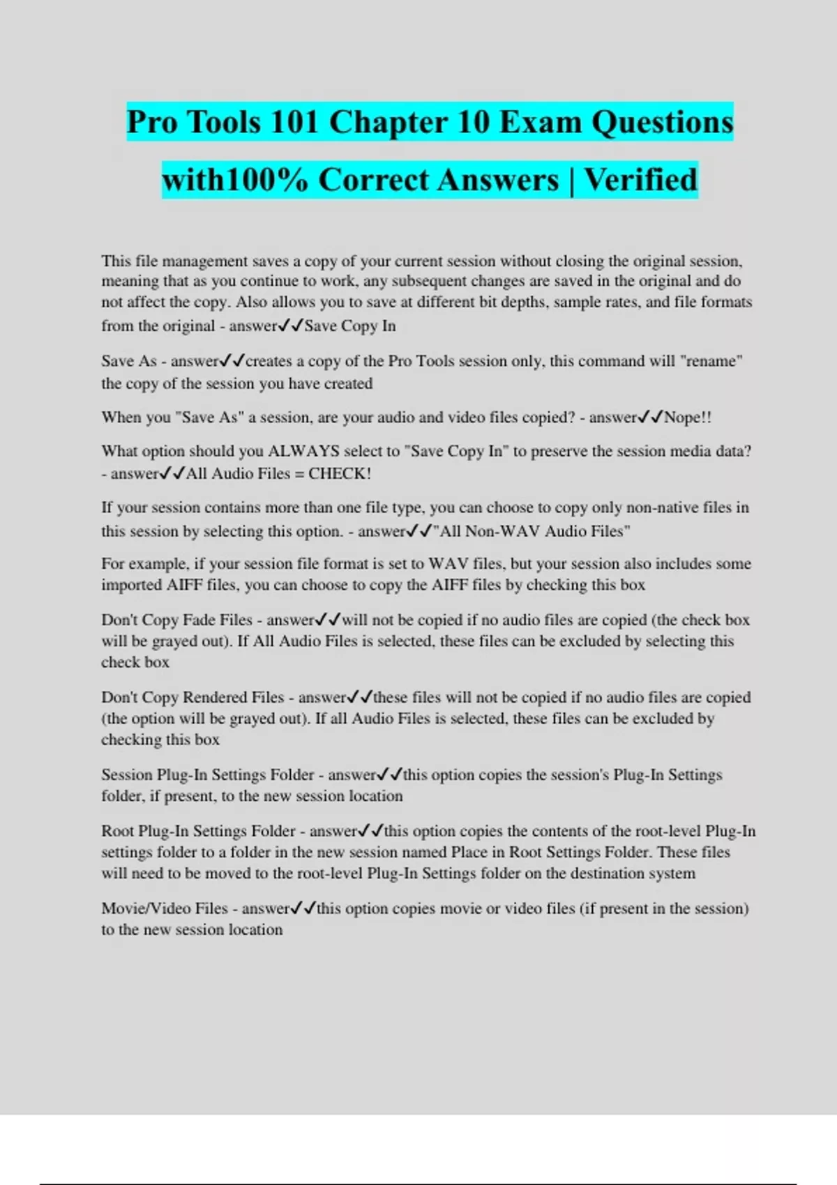 Pro Tools 101 Chapter 10 Exam Questions with100% Correct Answers | Verified This file management saves a copy of your current session without closing the original session, meaning that as you continue to work, any subsequent changes are saved in the original and do not affect the copy. Also allows you to save at different bit depths, sample rates, and file formats from the original - answerSave Copy In Save As - answercreates a copy of the Pro Tools session only, this command will "rename" the copy of the session you have created When you "Save As" a session, are your audio and video files copied? - answerNope!! What option should you ALWAYS select to "Save Copy In" to preserve the session media data? - answerAll Audio Files = CHECK! If your session contains more than one file type, you can choose to copy only non-native files in this session by selecting this option. - answer"All Non-WAV Audio Files" For example, if your session file format is set to WAV files, but your session also includes some imported AIFF files, you can choose to copy the AIFF files by checking this box Don't Copy Fade Files - answerwill not be copied if no audio files are copied (the check box will be grayed out). If All Audio Files is selected, these files can be excluded by selecting this check box Don't Copy Rendered Files - answerthese files will not be copied if no audio files are copied (the option will be grayed out). If all Audio Files is selected, these files can be excluded by checking this bo