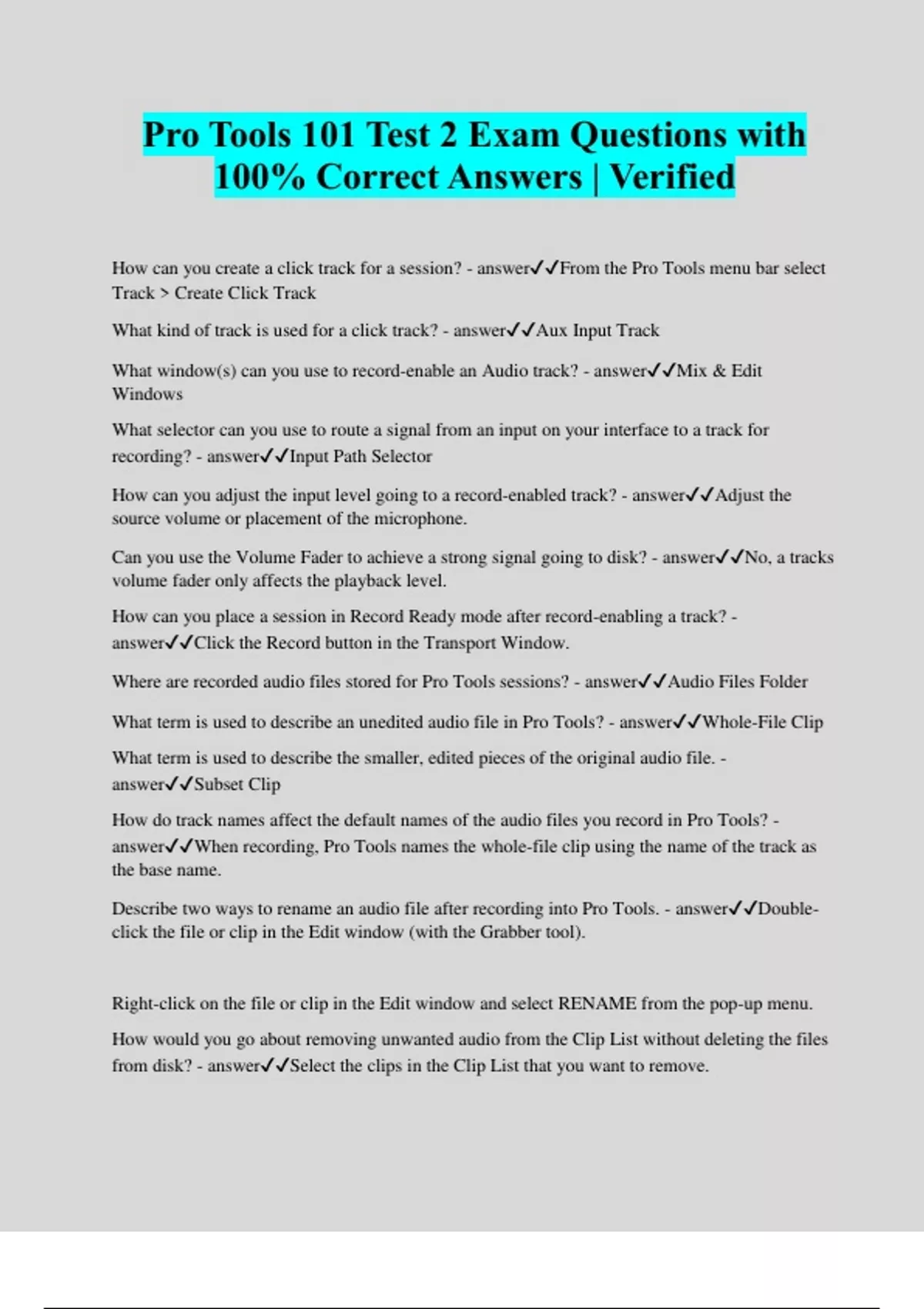 Pro Tools 101 Test 2 Exam Questions with 100% Correct Answers | Verified How can you create a click track for a session? - answerFrom the Pro Tools menu bar select Track > Create Click Track What kind of track is used for a click track? - answerAux Input Track What window(s) can you use to record-enable an Audio track? - answerMix & Edit Windows What selector can you use to route a signal from an input on your interface to a track for recording? - answerInput Path Selector How can you adjust the input level going to a record-enabled track? - answerAdjust the source volume or placement of the microphone. Can you use the Volume Fader to achieve a strong signal going to disk? - answerNo, a tracks volume fader only affects the playback level. How can you place a session in Record Ready mode after record-enabling a track? - answerClick the Record button in the Transport Window