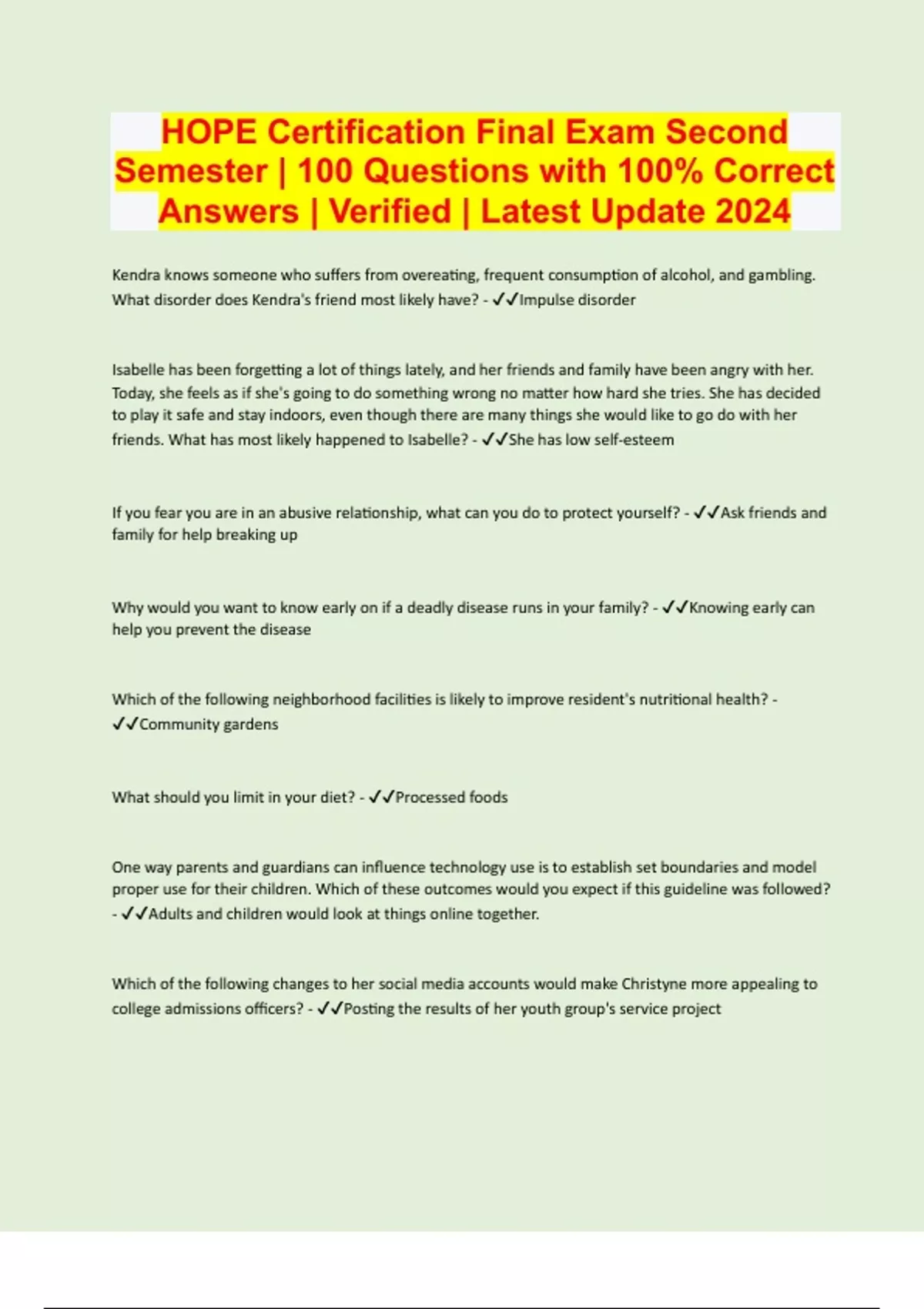 HOPE Certification Final Exam Second Semester | 100 Questions with 100% Correct Answers | Verified | Latest Update 2024