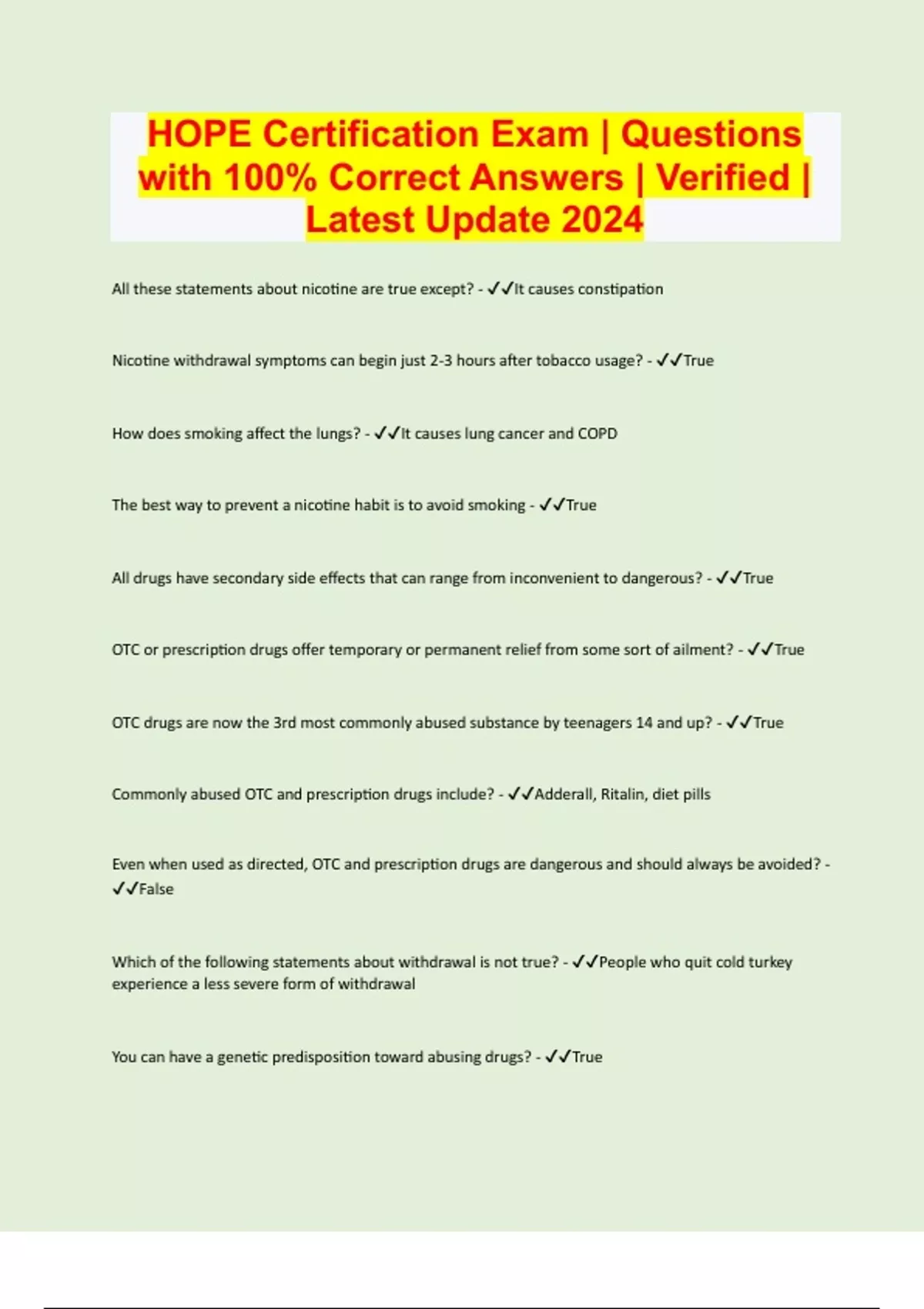 HOPE Certification Exam | Questions with 100% Correct Answers | Verified | Latest Update 2024