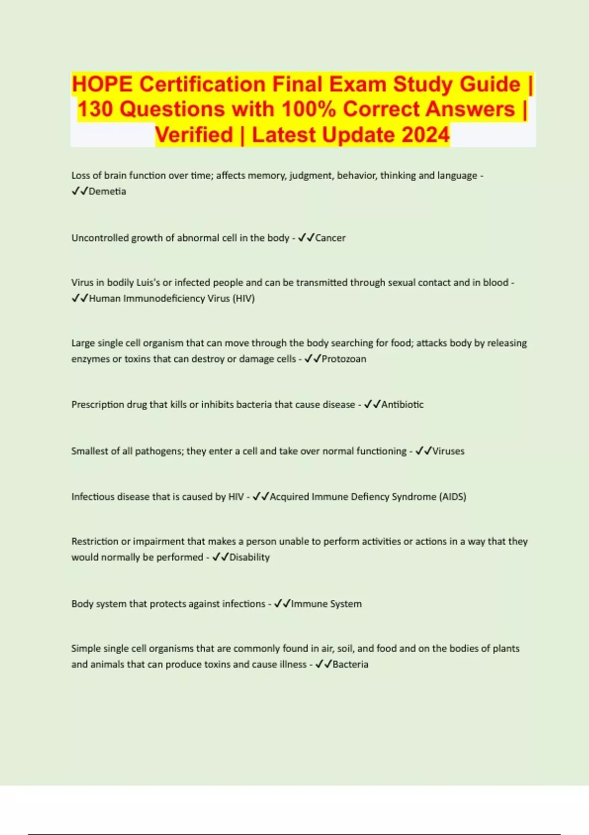 HOPE Certification Final Exam Study Guide | 130 Questions with 100% Correct Answers | Verified | Latest Update 2024