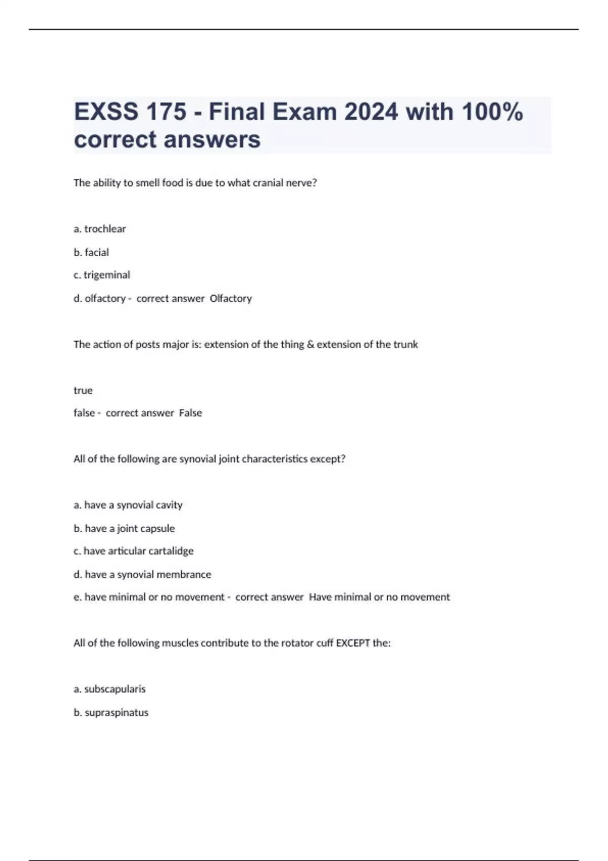 The ability to smell food is due to what cranial nerve? a. trochlear b. facial c. trigeminal d. olfactory - correct answer Olfactory The action of posts major is: extension of the thing & extension of the trunk true false - correct answer False All of the following are synovial joint characteristics except? a. have a synovial cavity b. have a joint capsule c. have articular cartalidge d. have a synovial membrance e. have minimal or no movement - correct answer Have minimal or no movement All of the following muscles contribute to the rotator cuff EXCEPT the: a. subscapularis b. supraspinatus c. teres m