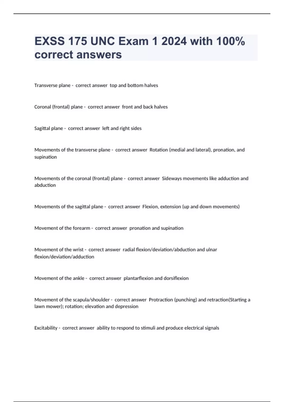 Transverse plane - correct answer top and bottom halves Coronal (frontal) plane - correct answer front and back halves Sagittal plane - correct answer left and right sides Movements of the transverse plane - correct answer Rotation (medial and lateral), pronation, and supination Movements of the coronal (frontal) plane - correct answer Sideways movements like adduction and abduction Movements of the sagittal plane - correct answer Flexion, extension (up and down movements) Movement of the forearm - correct answer pronation and supination Movement of the wrist - correct answer radial flexion/deviation/abduction and ulnar flexion/deviation/adduction Movement of the ankle - correct answer plantarflexion and dorsiflexion Movement of the scapula/shoulder - correct answer Protraction (punching) and retraction(Starting a lawn mower); rotation; elevation and depression