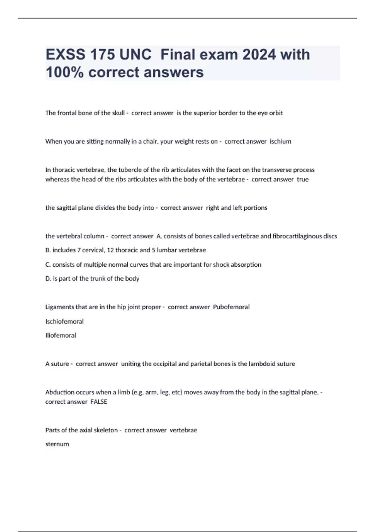 The frontal bone of the skull - correct answer is the superior border to the eye orbit When you are sitting normally in a chair, your weight rests on - correct answer ischium In thoracic vertebrae, the tubercle of the rib articulates with the facet on the transverse process whereas the head of the ribs articulates with the body of the vertebrae - correct answer true the sagittal plane divides the body into - correct answer right and left portions the vertebral column - correct answer A. consists of bones called vertebrae and fibrocartilaginous discs B. includes 7 cervical, 12 thoracic and 5 lumbar vertebrae C. consists of multiple normal curves that are important for shock absorption D. is part of the trunk of the body Ligaments that are in the hip joint proper - correct answer Pubofemoral Ischiofemoral Iliofemoral A suture - correct answer uniting the occipital and parietal bones is the lambdoid suture