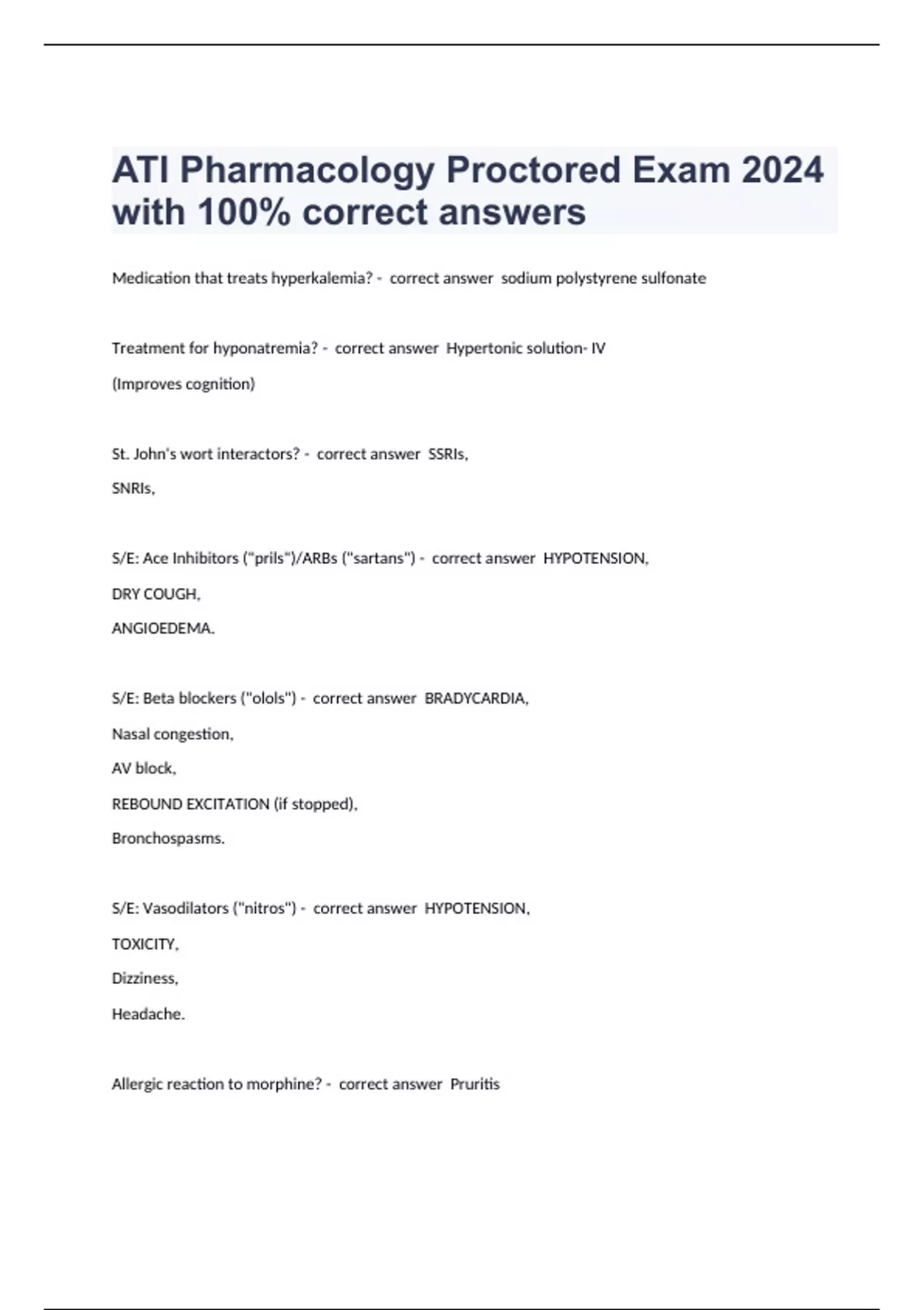 Medication that treats hyperkalemia? - correct answer sodium polystyrene sulfonate Treatment for hyponatremia? - correct answer Hypertonic solution- IV (Improves cognition) St. John's wort interactors? - correct answer SSRIs, SNRIs, S/E: Ace Inhibitors ("prils")/ARBs ("sartans") - correct answer HYPOTENSION, DRY COUGH, ANGIOEDEMA. S/E: Beta blockers ("olols") - correct answer BRADYCARDIA, Nasal congestion, AV block, REBOUND EXCITATION (if stopped), Bronchospasms. S/E: Vasodilators ("nitros") - correct answer HYPOTENSION, TOXICITY, Dizziness, Headache. Allergic reaction to morphine? - correct answer Pruritis Contraindication: Acetaminophen - correct answer Alcohol use disorder Urticaria= ? - correct answer Allergic reaction to a medication! Insulin administration steps: - correct answer Inject air into NPH, Inject air into Regular, Draw Regular, Draw NPH, Administer. Hypermagnesemia? - correct answer Calcium gluconate Enoxaparin Administration - correct answer Apply firm pressure to the site following administration.