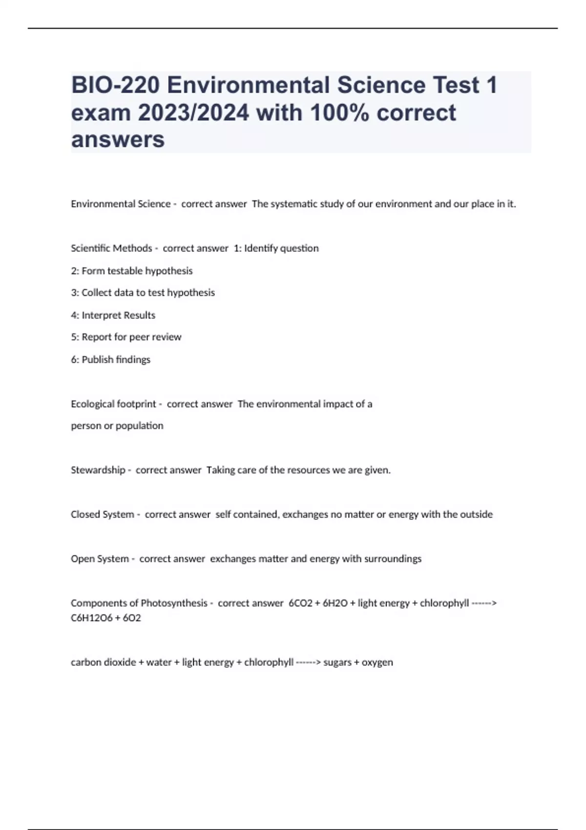 Environmental Science - correct answer The systematic study of our environment and our place in it. Scientific Methods - correct answer 1: Identify question 2: Form testable hypothesis 3: Collect data to test hypothesis 4: Interpret Results 5: Report for peer review 6: Publish findings Ecological footprint - correct answer The environmental impact of a person or population Stewardship - correct answer Taking care of the resources we are given. Closed System - correct answer self contained, exchanges no matter or energy with the outside Open System - correct answer exchanges matter and energy with surroundings Components of Photosynthesis - correct answer 6CO2 + 6H2O + light energy + chlorophyll ------> C6H12O6 + 6O2 carbon dioxide + water + light energy + chlorophyll ------> sugars + oxygen La