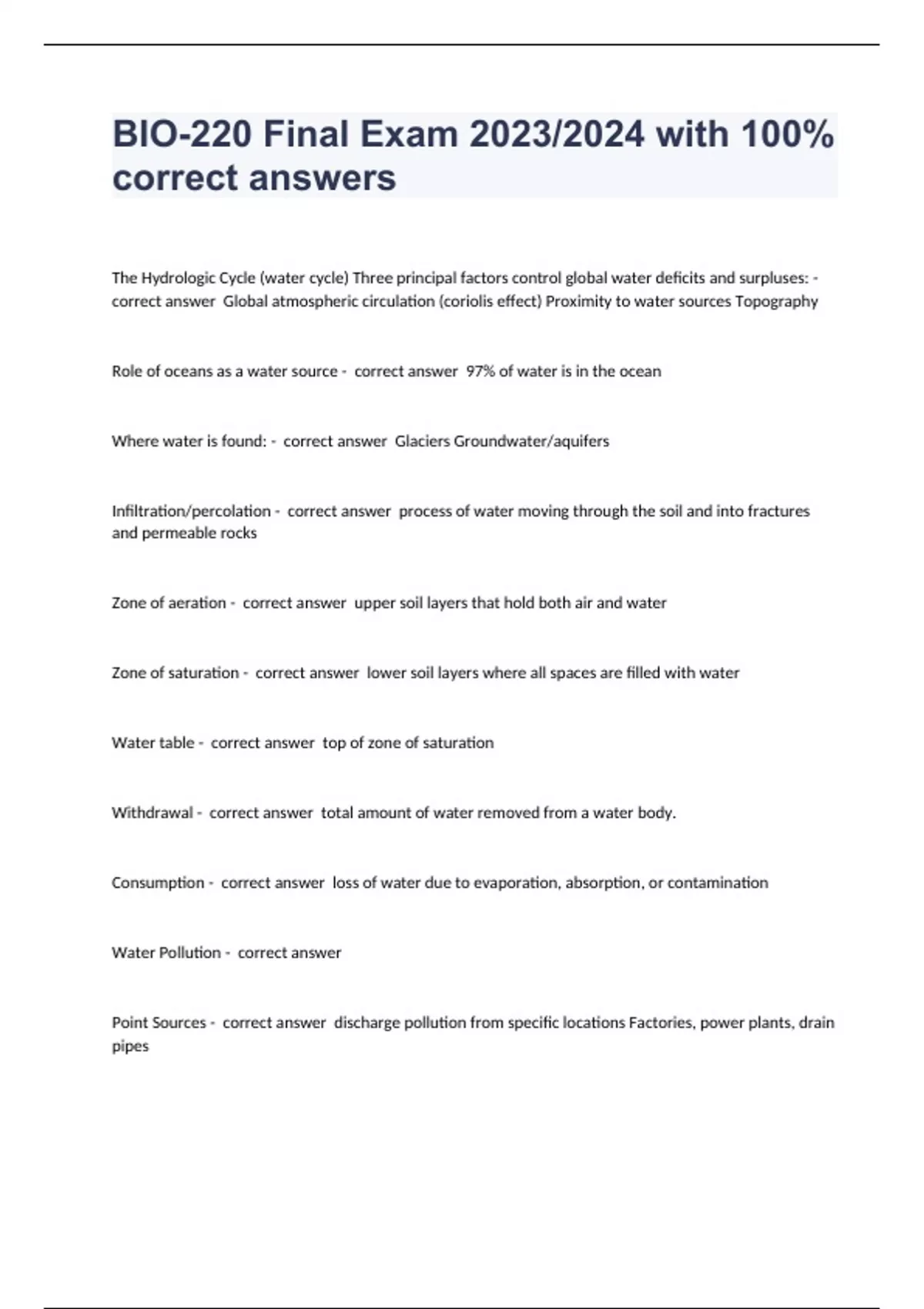 The Hydrologic Cycle (water cycle) Three principal factors control global water deficits and surpluses: - correct answer Global atmospheric circulation (coriolis effect) Proximity to water sources Topography Role of oceans as a water source - correct answer 97% of water is in the ocean Where water is found: - correct answer Glaciers Groundwater/aquifers Infiltration/percolation - correct answer process of water moving through the soil and into fractures and permeable rocks Zone of aeration - correct answer upper soil layers that hold both air and water Zone of saturation - correct answer lower soil layers where all spaces are filled with water Water table - correct answer top of zone of saturation Withdrawal - correct answer total amount of water removed from a water body. Consumption - correct answer loss of water due to evaporation, absorption, or contamination Water Pollution - correct answer Point Sources - correct answer discharge pollution from specific locations Factories, power plants, drain pipes