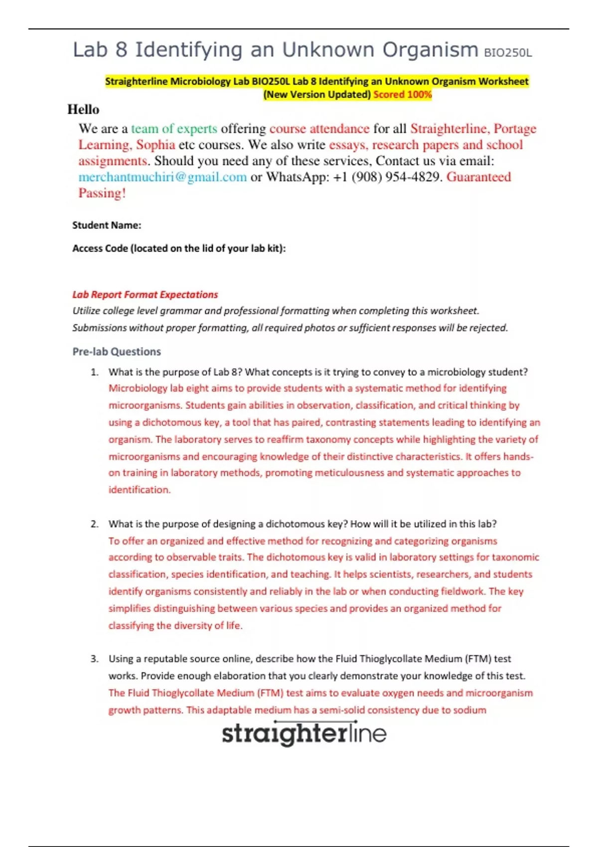 Straighterline Microbiology Lab BIO250L Lab 8 Identifying an Unknown Organism Worksheet (New Version Updated) Scored 100%