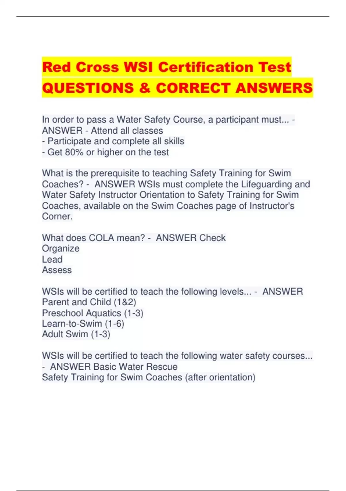 Red Cross WSI Certification Test QUESTIONS & CORRECT ANSWERS In order to pass a Water Safety Course, a participant must... - ANSWER - Attend all classes - Participate and complete all skills - Get 80% or higher on the test What is the prerequisite to teaching Safety Training for Swim Coaches? - ANSWER WSIs must complete the Lifeguarding and Water Safety Instructor Orientation to Safety Training for Swim Coaches, available on the Swim Coaches page of Instructor's Corner. What does COLA mean? - ANSWER Check Organize Lead Assess WSIs will be certified to teach the following levels... - ANSWER Parent and Child (1&2) Preschool Aquatics (1-3) Learn-to-Swim (1-6) Adult Swim (1-3) WSIs will be certified to teach the following water safety courses... - ANSWER Basic Water Rescue Safety Training for Swim Coaches (after orientation) WSIs will be certified to teach the following presentations... - ANSWER Longfellow WHALE tales (goal is to teach children safe behavior) Sun safety Parent orientation to swim course What is the difference between a block plan and a lesson plan? - ANSWER A block plan is an organization of the entire class. A lesson plan is one detailed day from the block plan. Red Cross recommends teaching from the lesson plan. What does the Water Safety Instructor's Manual (WSIM) do? - ANSWER It teaches WSIs how to plan and conduct classes. What does the Swimming and Water Safety Manual do? - ANSWER WSIs should use it for general reference. What is the Swimming and Diving Skills DVD used for? - ANSWER Demonstration What is the Teaching Swimming and Watery Safety DVD used for? - ANSWER Only by the teacher as reference material, NOT students. What do you need to report to the Red Cross after teaching ARC courses? - ANSWER The course Number of participants Submit names if you give certificates