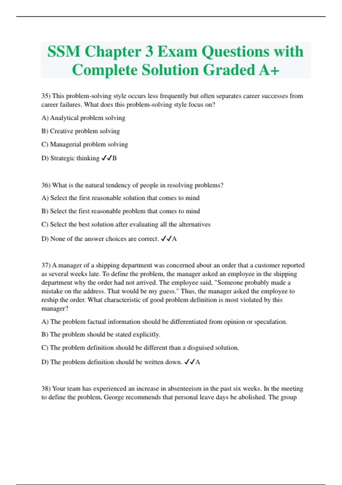 SSM Chapter 3 Exam Questions with Complete Solution Graded A+ 35) This problem-solving style occurs less frequently but often separates career successes from career failures. What does this problem-solving style focus on? A) Analytical problem solving B) Creative problem solving C) Managerial problem solving D) Strategic thinking B 36) What is the natural tendency of people in resolving problems? A) Select the first reasonable solution that comes to mind B) Select the first reasonable problem that comes to mind C) Select the best solution after evaluating all the alternatives D) None of the answer choices are correct. A 37) A manager of a shipping department was concerned about an order that a customer reported as several weeks late. To define the problem, the manager asked an employee in the shipping department why the order had not arrived. The employee said, "Someone probably made a mistake on the address. That would be my guess." Thus, the manager asked the employee to reship the order. What characteristic of good problem definition is most violated by this manager? A) The problem factual information should be differentiated from opinion or speculation. B) The problem should be stated explicitly. C) The problem definition should be different than a disguised solution. D) The problem definition should be written down. A