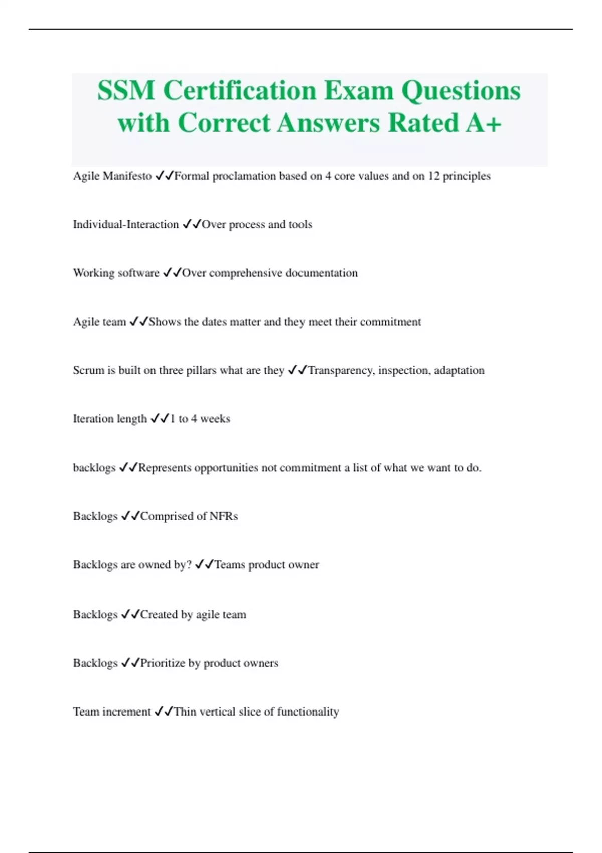 SSM Certification Exam Questions with Correct Answers Rated A+ Agile Manifesto Formal proclamation based on 4 core values and on 12 principles Individual-Interaction Over process and tools Working software Over comprehensive documentation Agile team Shows the dates matter and they meet their commitment Scrum is built on three pillars what are they Transparency, inspection, adaptation Iteration length 1 to 4 weeks backlogs Represents opportunities not commitment a list of what we want to do. Backlogs Comprised of NFRs Backlogs are owned by? Teams product owner Backlogs Created by agile team Backlogs Prioritize by product owners Team increment Thin vertical slice of functionality