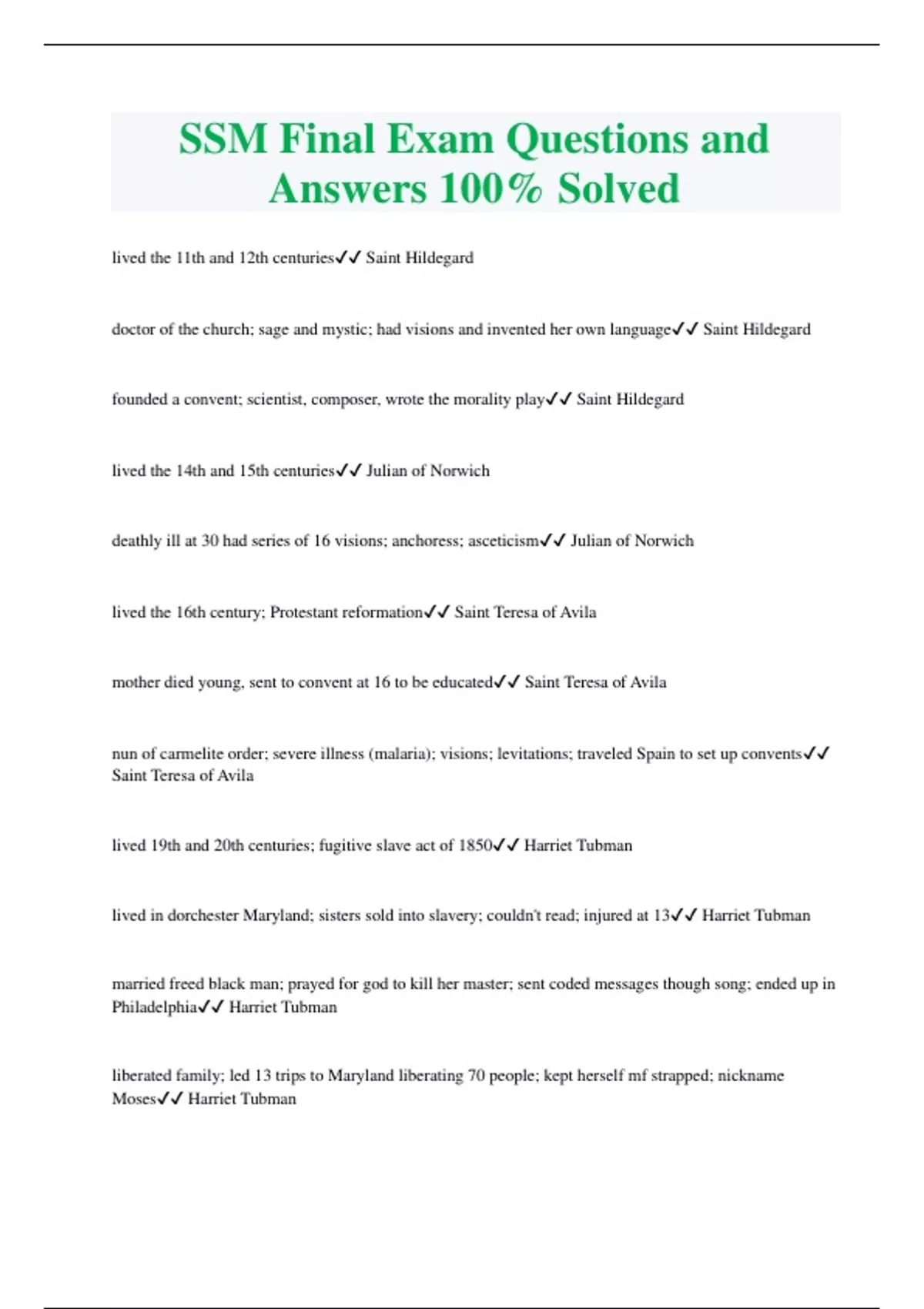 SSM Final Exam Questions and Answers 100% Solved lived the 11th and 12th centuries Saint Hildegard doctor of the church; sage and mystic; had visions and invented her own language Saint Hildegard founded a convent; scientist, composer, wrote the morality play Saint Hildegard lived the 14th and 15th centuries Julian of Norwich deathly ill at 30 had series of 16 visions; anchoress; asceticism Julian of Norwich lived the 16th century; Protestant reformation Saint Teresa of Avila mother died young, sent to convent at 16 to be educated Saint Teresa of Avila nun of carmelite order; severe illness (malaria); visions; levitations; traveled Spain to set up convents Saint Teresa of Avila lived 19th and 20th centuries; fugitive slave act of 1850 Harriet Tubman
