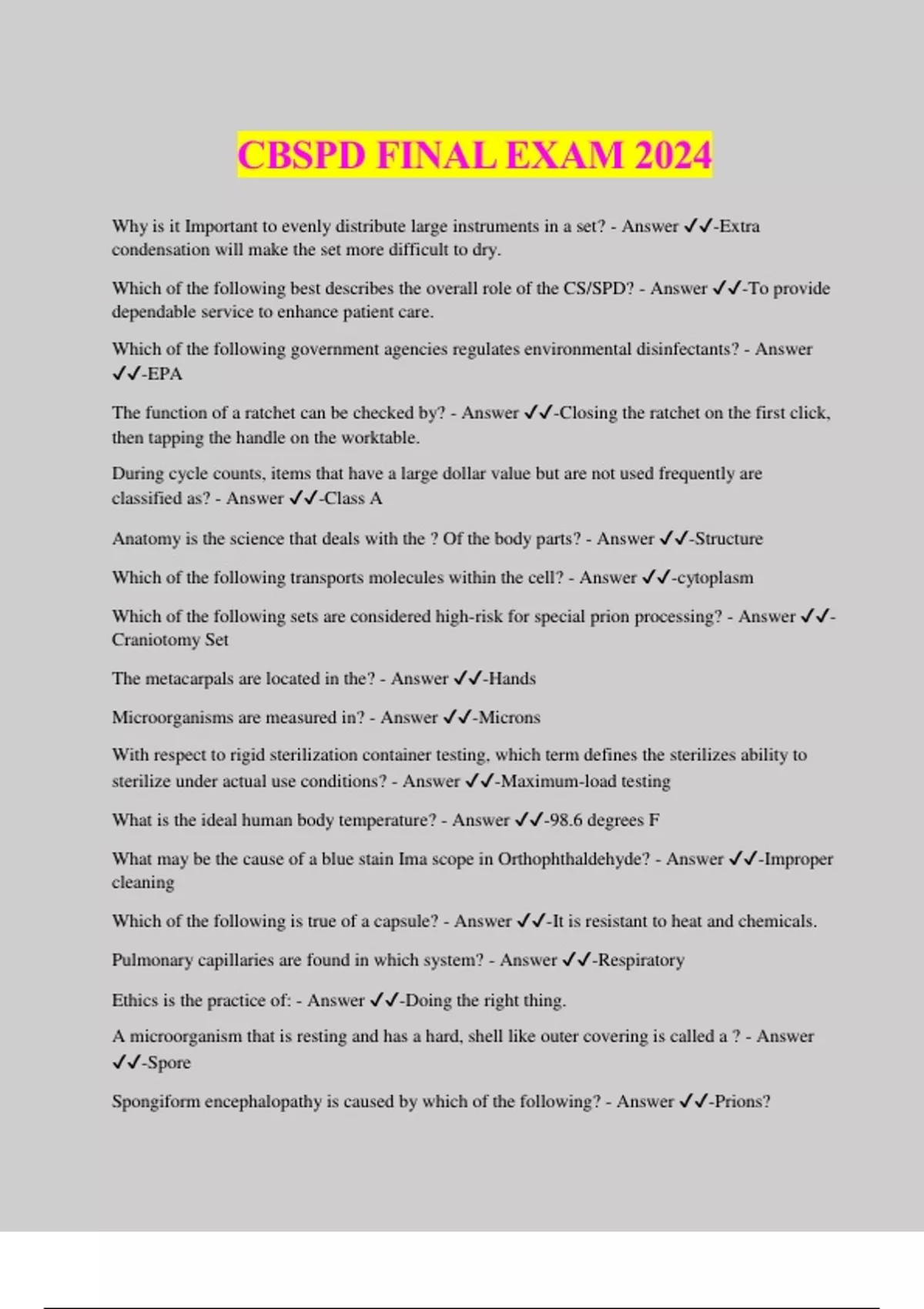 CBSPD FINAL EXAM 2024 Why is it Important to evenly distribute large instruments in a set? - Answer ️️ -Extra condensation will make the set more difficult to dry. Which of the following best describes the overall role of the CS/SPD? - Answer ️️ -To provide dependable service to enhance patient care. Which of the following government agencies regulates environmental disinfectants? - Answer ️️ -EPA The function of a ratchet can be checked by? - Answer ️️ -Closing the ratchet on the first click, then tapping the handle on the worktable. During cycle counts, items that have a large dollar value but are not used frequently are classified as? - Answer ️️ -Class A Anatomy is the science that deals with the ? Of the body parts? - Answer ️️ -Structure Which of the following transports molecules within the cell? - Answer ️️ -cytoplasm Which of the following sets are considered high-risk for special prion processing? - Answer ️️ - Craniotomy Set The metacarpals are located in the? - Answer ️️ -Hands Microorganisms are measured in? - Answer ️️ -Microns With respect to rigid sterilization container testing, which term defines the sterilizes ability to sterilize under actual use conditions? - Answer ️️ -Maximum-load testing What is the ideal human body temperature? - Answer ️️ -98.6 degrees F What may be the cause of a blue stain Ima scope in Orthophthaldehyde? - Answer ️️ -Improper cleaning Which of the following is true of a capsule? - Answer ️️ -It is resistant to heat and chemicals. Pulmonary capillaries are found in which system? - Answer ️️ -Respiratory Ethics is the practice of: - Answer ️️ -Doing the right thing. A microorganism that is resting and has a hard, shell like outer covering is called a ? - Answer ️️ -Spore Spongiform encephalopathy is caused by which of the following? - Answer ️️ -Prions?