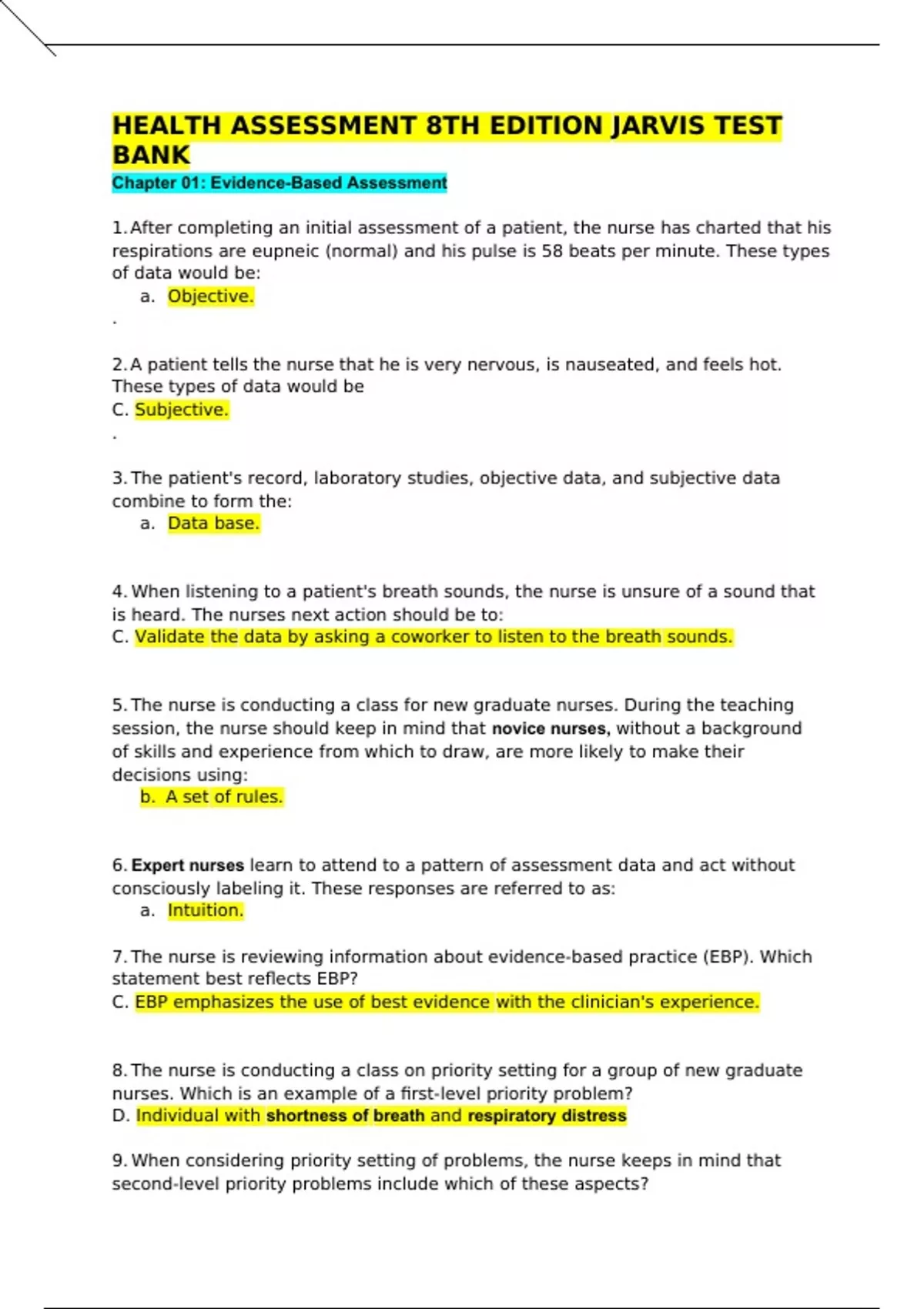 HEALTH ASSESSMENT 8TH EDITION JARVIS TEST BANK Chapter 01: Evidence-Based Assessment 1. After completing an initial assessment of a patient, the nurse has charted that his respirations are eupneic (normal) and his pulse is 58 beats per minute. These types of data would be: a. Objective. . 2. A patient tells the nurse that he is very nervous, is nauseated, and feels hot. These types of data would be C. Subjective. . 3. The patient's record, laboratory studies, objective data, and subjective data combine to form the: a. Data base. 4. When listening to a patient's breath sounds, the nurse is unsure of a sound that is heard. The nurses next action should be to: C. Validate the data by asking a coworker to listen to the breath sounds. 5. The nurse is conducting a class for new graduate nurses. During the teaching session, the nurse should keep in mind that novice nurses, without a background of skills and experience from which to draw, are more likely to make their decisions using: b. A set of rules. 6. Expert nurses learn to attend to a pattern of assessment data and act without consciously labeling it. These responses are referred to as: a. Intuition. 7. The nurse is reviewing information about evidence-based practice (EBP). Which statement best reflects EBP? C. EBP emphasizes the use of best evidence with the clinician's experience. 8. The nurse is conducting a class on priority setting for a group of new graduate nurses. Which is an example of a first-level priority problem? D. Individual with shortness of breath and respiratory distress 9. When considering priority setting of problems, the nurse keeps in mind that second-level priority problems include which of these aspects? C. Abnormal laboratory values 10. Which critical thinking skill helps the nurse see relationships among the data? b. Clustering related cues 11. The nurse knows that developing appropriate nursing interventions for a patient relies on the appropriateness of the diagnosis. a. Nursing 12. The nursing process is a sequential method of problem solving that nurses use and includes which steps? D. Assessment, diagnosis, outcome identification, planning, implementation, and evaluation 13. A newly admitted patient is in acute pain, has not been sleeping well lately, and is having difficulty breathing. How should the nurse prioritize these problems? a. Breathing, pain, and sleep 14. Which of these would be formulated by a nurse using diagnostic reasoning? C. Diagnostic hypothesis 15. Barriers to incorporating EBP include: a. Nurses lack of research skills in evaluating the quality of research studies. 16. What step of the nursing process includes data collection by health history, physical examination, and interview? D. Assessment 17. During a staff meeting, nurses discuss the problems with accessing research studies to incorporate evidence-based clinical decision making into their practice. Which suggestion by the nurse manager would best help these problems? D. Teach the nurses how to conduct electronic searches for research studies. 18. When reviewing the concepts of health, the nurse recalls that the components of holistic health include which of these? D. Holistic health views the mind, body, and spirit as interdependent. 19. The nurse recognizes that the concept of prevention in describing health is essential because: C. Prevention places the emphasis on the link between health and personal behavior. 20. The nurse is performing a physical assessment on a newly admitted patient. An example of objective information obtained during the physical assessment includes the: D. 2 5 cm scar on the right lower forearm. 21. A visiting nurse is making an initial home visit for a patient who has many chronic medical problems. Which type of database is most appropriate to collect in this setting? C. A complete health database because of the nurses primary responsibility for monitoring the patients health 22. Which situation is most appropriate during which the nurse performs a focused or problem-centered history? D. Patient in an outpatient clinic has cold and influenza-like symptoms. 23. A patient is at the clinic to have her blood pressure checked. She has been coming to the clinic weekly since she changed medications 2 months ago. The nurse should: a. Collect a follow-up database and then check her blood pressure. 24. A patient is brought by ambulance to the emergency department with multiple traumas received in an automobile accident. He is alert and cooperative, but his injuries are quite severe. How would the nurse proceed with data collection? b. Simultaneously ask history questions while performing the examination and initiating life- saving measures. 25. A 42-year-old patient of Asian descent is being seen at the clinic for an initial examination. The nurse knows that including cultural information in his health assessment is important to: D. Provide culturally sensitive and appropriate care. 26. In the health promotion model, the focus of the health professional includes: D. Helping the consumer choose a healthier lifestyle. 27. The nurse has implemented several planned interventions to address the nursing diagnosis of acute pain. Which would be the next appropriate action? c. Evaluate the individual's condition, and compare actual outcomes with expected outcomes. 28. Which statement best describes a proficient nurse? A proficient nurse is one who: d. Understands a patient situation as a whole rather than a list of tasks and recognizes the long-term goals for the patient. 29. The nurse is reviewing data collected after an assessment. Of the data listed below, which would be considered related cues that would be clustered together during data analysis? Select all that apply. Inspiratory wheezes noted in left lower lobes Nonproductive cough Patient reports dyspnea upon exertion Rate of respirations 16 breaths per minute ANS: A, C, E, F 30. Put the following patient situations in order according to the level of priority. a. A 
