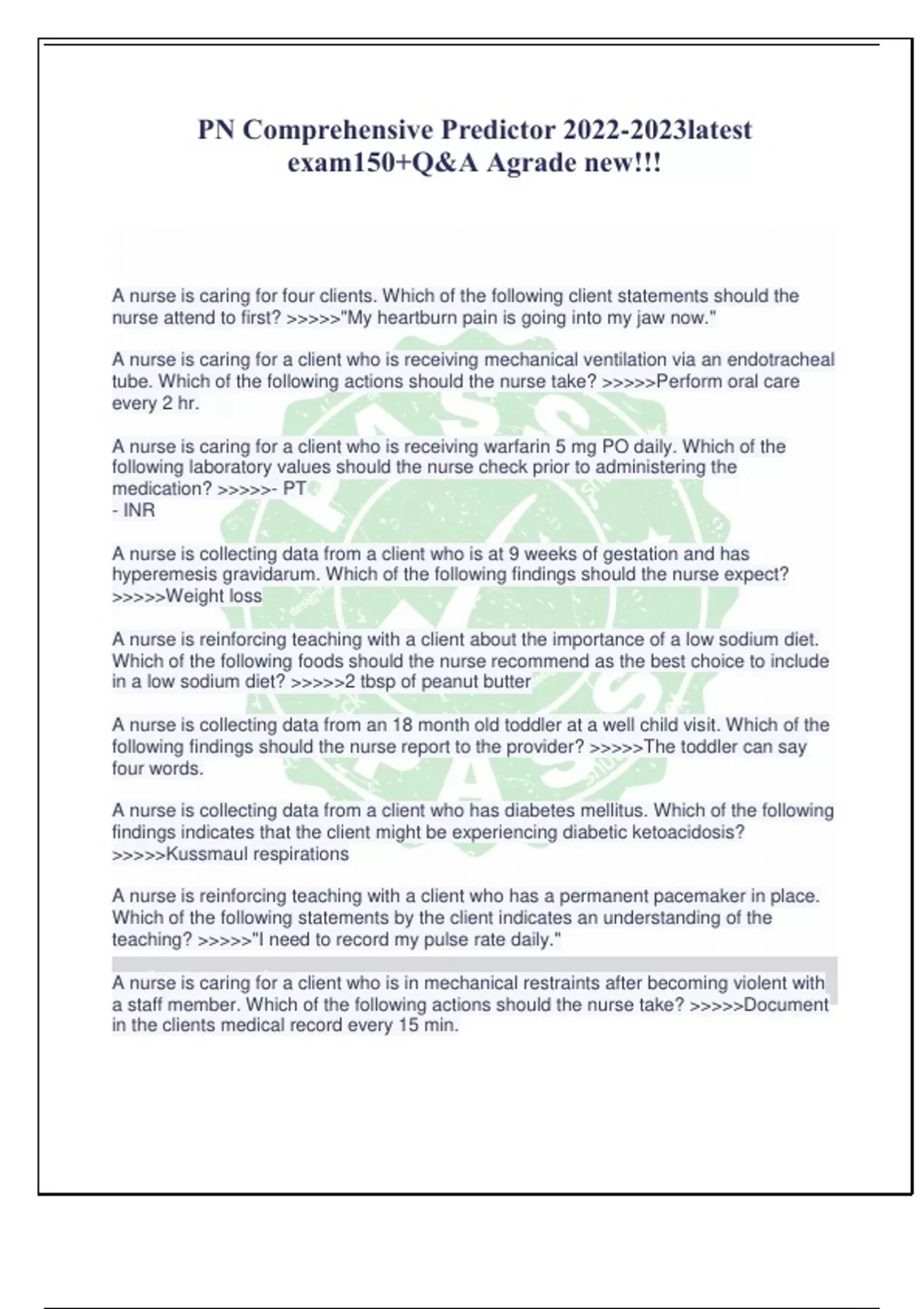 PN Comprehensive Predictor latest exam150+Q&A Agrade new!!! A nurse is caring for four clients. Which of the following client statements should the nurse attend to first? >>>>>"My heartburn pain is going into my jaw now." A nurse is caring for a client who is receiving mechanical ventilation via an endotracheal tube. Which of the following actions should the nurse take? >>>>>Perform oral care every 2 hr. A nurse is caring for a client who is receiving warfarin 5 mg PO daily. Which of the following laboratory values should the nurse check prior to administering the medication? >>>>>- PT - INR A nurse is collecting data from a client who is at 9 weeks of gestation and has hyperemesis gravidarum. Which of the following findings should the nurse expect? >>>>>Weight loss A nurse is reinforcing teaching with a client about the importance of a low sodium diet. Which of the following foods should the nurse recommend as the best choice to include in a low sodium diet? >>>>>2 tbsp of peanut butter A nurse is collecting data from an 18 month old toddler at a well child visit. Which of the following findings should the nurse report to the provider? >>>>>The toddler can say four words. A nurse is collecting data from a client who has diabetes mellitus. Which of the following findings indicates that the client might be experiencing diabetic ketoacidosis? >>>>>Kussmaul respirations A nurse is reinforcing teaching with a client who has a permanent pacemaker in place. Which of the following statements by the client indicates an understanding of the teaching? >>>>>"I need to record my pulse rate daily." A nurse is caring for a client who is in mechanical restraints after becoming violent with a staff member. Which of the following actions should the nurse take? >>>>>Document in the clients medical record every 15 min. A nurse is reinforcing teaching about self-administration of nasal drops with a client. Which of the following positions should the nurse recommend for instillation of the drops? >>>>>Supine A nurse is preparing to administer furosemide to a client who has heart failure. Which of the following laboratory results should the nurse review prior to administering the medication? >>>>>Potassium A nurse is caring for a client who has methicillin-resistant staphylococcus aureus (MRSA) infection. Which of the following actions should the nurse plan to take? >>>>>Don a gown and gloves when providing perineal care A nurse is assisting with the plan of care for a client who has dementia and often wanders in the halls at night. Which of the following interventions should the nurse recommend including in the plan of care? >>>>>Labeling the clients bathroom door A charge nurse is reinforcing teaching with a newly hired licensed practical nurse about scope of practice. Which of the following responsibilities should the nurse include in the teaching? >>>>>Providing direct client care A nurse is working on a mental health unit is meeting with a client who has been in the unit for 2 days. The nurse greets the client and asks, "What has been happening with you today?" Which of the following therapeutic techniques is the nurse using? >>>>>Reflecting A nurse us reinforcing teaching with a group of expectant parents regarding the proper use of a car seat. Which of the following statements by a parent indicates an understanding of the teaching? >>>>>"I will secure the seat belt across my newborns lap." A nurse from a medical surgical unit is floating to a postpartum unit. Which of the following clients is an appropriate assignment for the nurse to accept? >>>>>A client who underwent removal of a retained placenta A nurse is assisting with planning care for a newly admitted client who has anorexia nervosa. Which of the following interventions should the nurse recommend to include in the plan of care? >>>>>Reinforce teaching about healthy eating during meals A nurse is admitting a client who is scheduled for an elective surgery. Which of he following actions should the nurse take to verify the status of the clients advance directives? >>>>>Ask the client whether they have advance directives A nurse is collecting data from a client who is receiving a continuous IV infusion of 0.9% sodium chloride. The nurse discovers the IV infusion pump was set incorrectly and the client received 200 ml more than prescribed. Data collection reveals that the client is stable. The nurse recognizes that this incident is not considered malpractice for which of the following reasons? >>>>>The client was not harmed as a result of the incident A nurse is caring for a client who has COPD. The nurse should identify that which of the following findings is the priority to report? >>>>>Productive cough with green sputum A nurse is caring for a newborn who just had a circumcision. Which of the following findings should the nurse identify as a nonverbal sign of pain? >>>>>The newborn continues to cry despite efforts to console A nurse is reinforcing teaching with a parent about appropriate snacks for a toddler. Which of the following foods should the nurse include? >>>>>Graham crackers A nurse is caring for a client who is breastfeeding their 5-day old newborn. Which of the following should the nurse identify as an indication that the newborn is breastfeeding effectively? >>>>>Makes audible swallowing sounds A nurse is reinforcing teaching with a client who has a new diagnosis of myasthenia gravis (MG) and a prescription for neostigmine. Which of the following information should the nurse include about the action of the medication? >>>>>Improves muscle strength A nurse is reinforcing teaching with the parents of a newborn who had a circumcision. Which of the following client statements indicates understanding of the teaching? >>>>>"I will apply petroleum jelly to the penis with each diaper change." A nurse is collecting data from a 3 month old infant who is 6 hr postoperative following a cleft palate repair. Which of the following pain rating tool