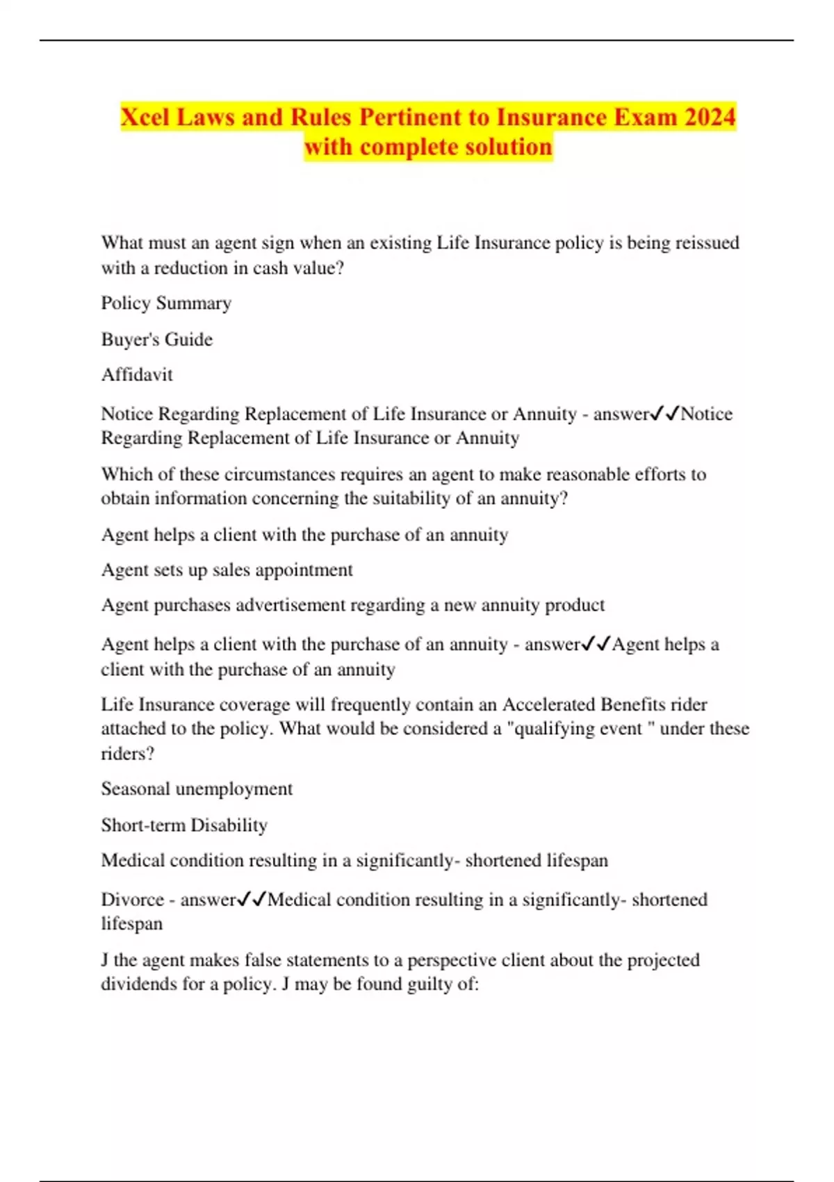 Xcel Laws and Rules Pertinent to Insurance Exam 2024 with complete solution What must an agent sign when an existing Life Insurance policy is being reissued with a reduction in cash value? Policy Summary Buyer's Guide Affidavit Notice Regarding Replacement of Life Insurance or Annuity - answerNotice Regarding Replacement of Life Insurance or Annuity Which of these circumstances requires an agent to make reasonable efforts to obtain information concerning the suitability of an annuity? Agent helps a client with the purchase of an annuity Agent sets up sales appointment Agent purchases advertisement regarding a new annuity product Agent helps a client with the purchase of an annuity - answerAgent helps a client with the purchase of an annuity Life Insurance coverage will frequently contain an Accelerated Benefits rider attached to the policy. What would be considered a "qualifying event " under these riders? Seasonal unemployment Short-term Disability Medical condition resulting in a significantly- shortened lifespan Divorce - answerMedical condition resulting in a significantly- shortened lifespan J the agent makes false statements to a perspective client about the projected dividends for a policy. J may be found guilty of: Defamation Misrepresentation Subrogation Twisting - answerMisrepresentation Which of the following is th